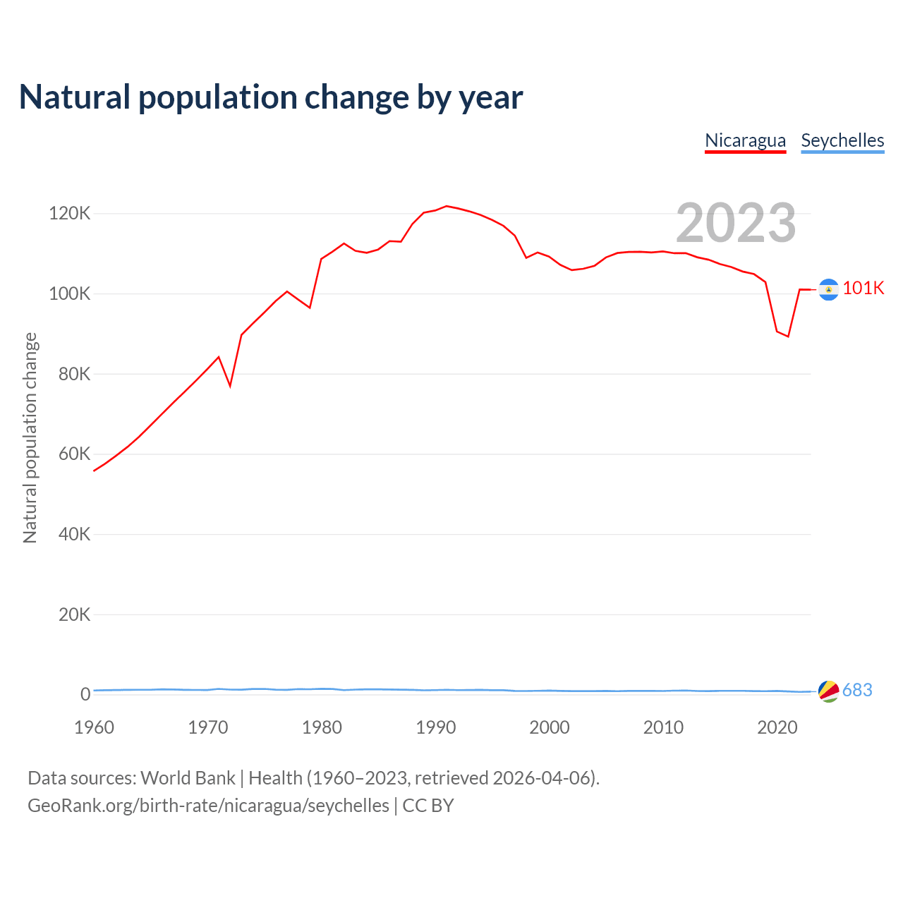 According to the latest available data on birth rates, the fertility rate in Nicaragua was 2.22 children per woman in 2023, compared to 2.02 in the Seychelles in 2023. The replacement level is considered to be 2.1 children per woman.
