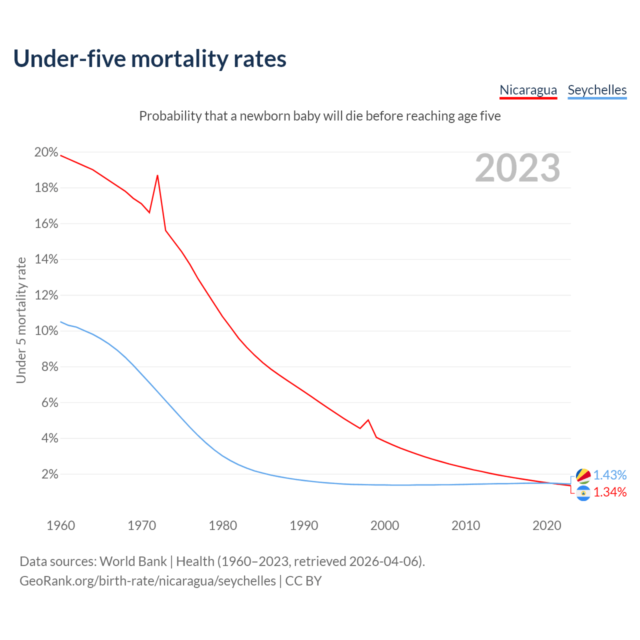 The chance that a newborn baby will die before reaching age five is 1.34% in Nicaragua and 1.43% in the Seychelles. Above is a chart with historical data on under-five mortality rates.