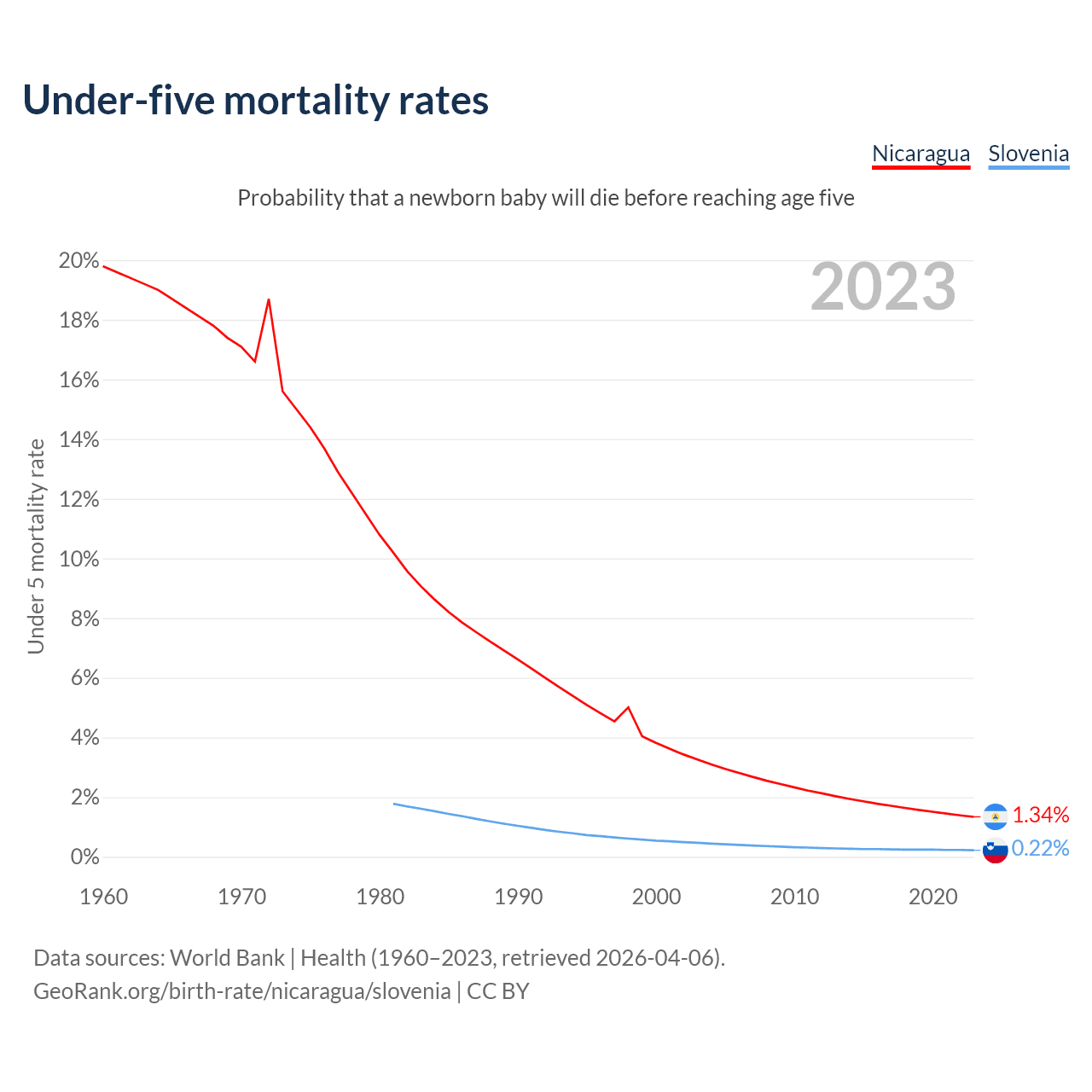 The chance that a newborn baby will die before reaching age five is 1.34% in Nicaragua and 0.22% in Slovenia. Above is a chart with historical data on under-five mortality rates.