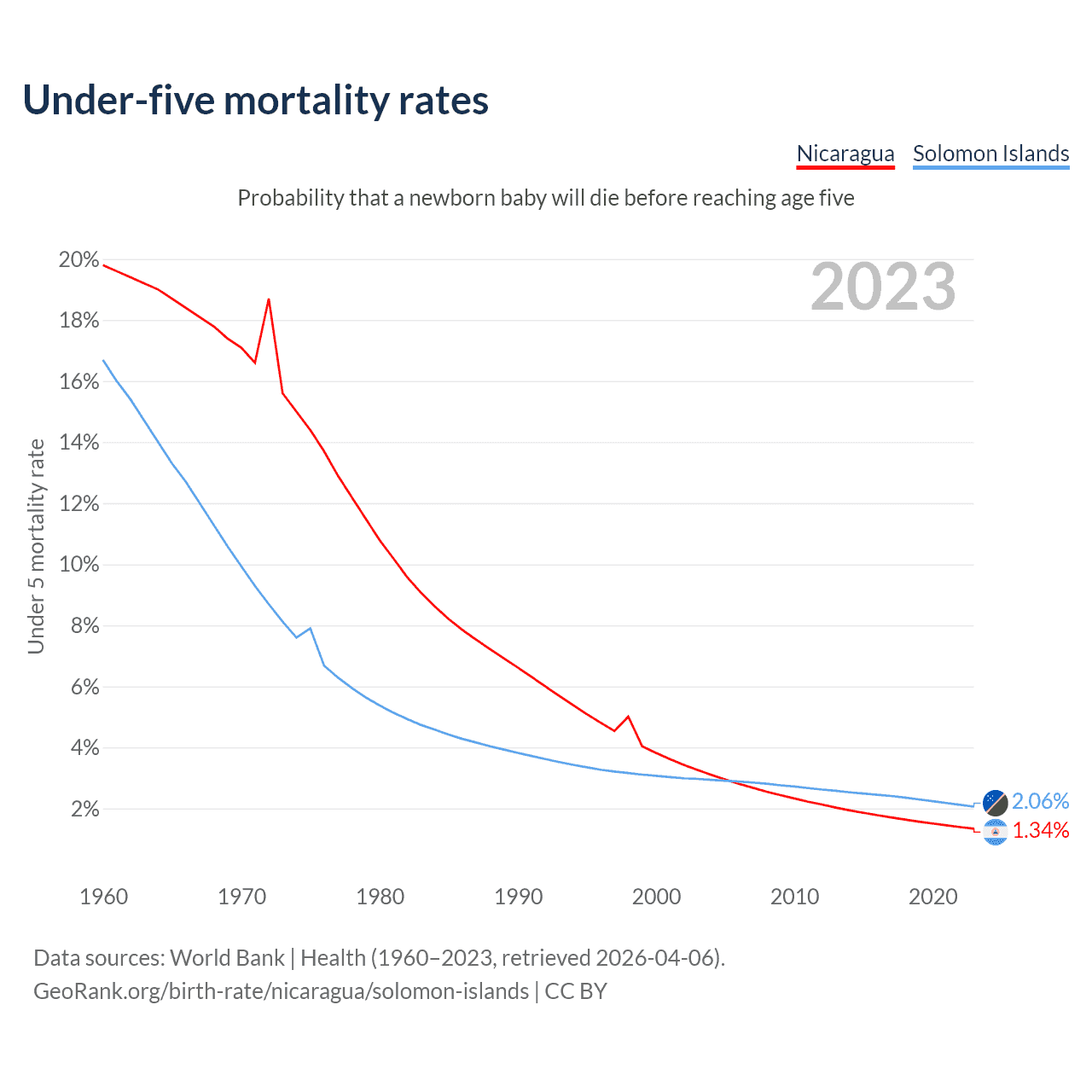 The chance that a newborn baby will die before reaching age five is 1.34% in Nicaragua and 2.06% in the Solomon Islands. Above is a chart with historical data on under-five mortality rates.