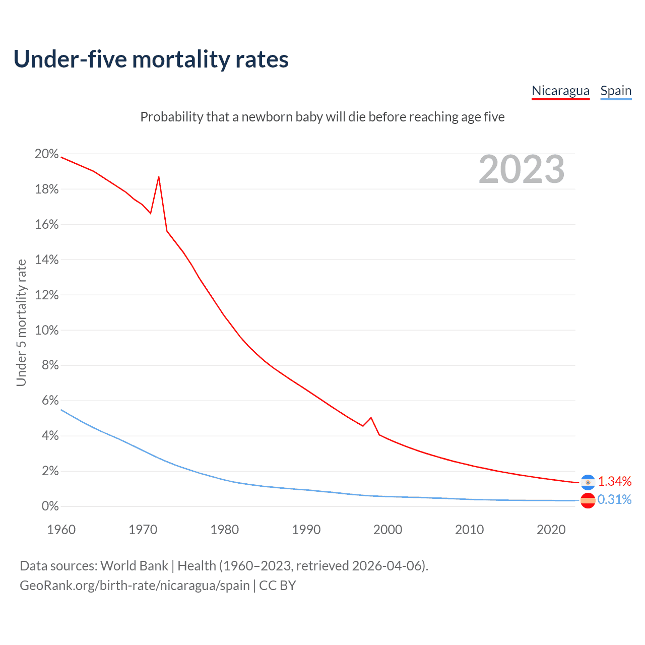 The chance that a newborn baby will die before reaching age five is 1.34% in Nicaragua and 0.31% in Spain. Above is a chart with historical data on under-five mortality rates.