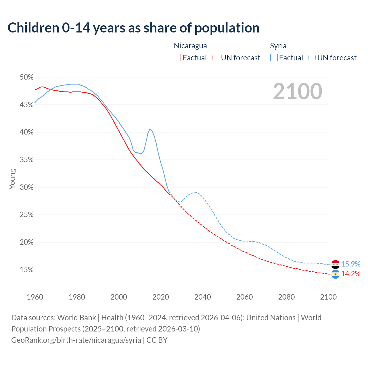 According to the latest available data on birth rates, the fertility rate in Nicaragua was 2.22 children per woman in 2023, compared to 2.71 in Syria in 2023. The replacement level is considered to be 2.1 children per woman.