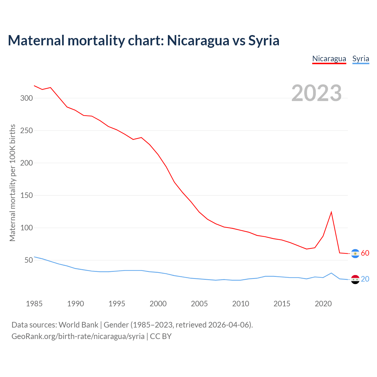 The maternal mortality rate, which is the probability of dying during childbirth or within 42 days of pregnancy termination, is 60 deaths per 100,000 live births in Nicaragua, compared to 20 deaths in Syria.