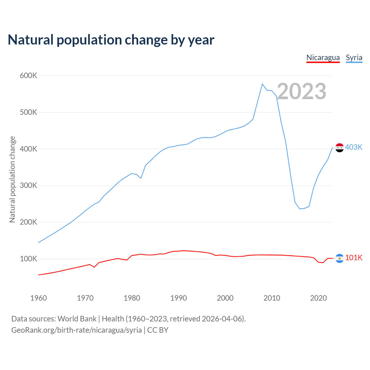 Nicaragua has an annual birth rate of 19.4 births per 1,000 people, compared to 22.1 for Syria. The average number of children a woman is expected to have during her lifetime — the fertility rate, is 2.22 in Nicaragua and 2.71 in Syria — 22.3% difference.