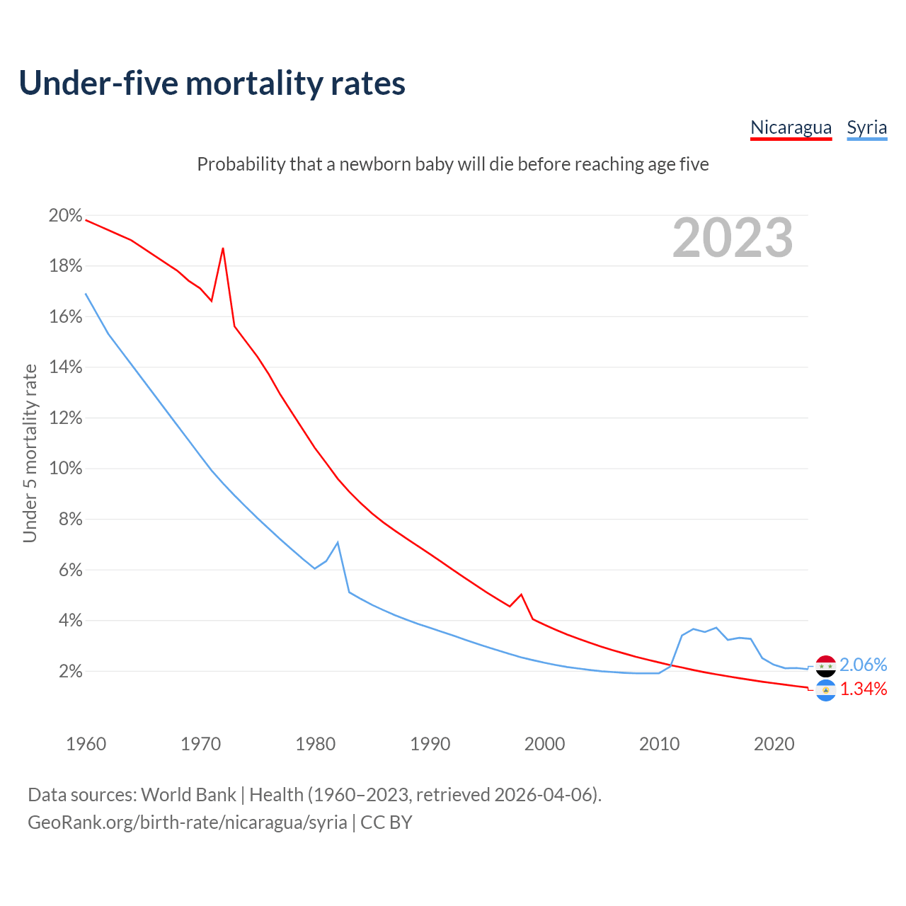 The chance that a newborn baby will die before reaching age five is 1.34% in Nicaragua and 2.06% in Syria. Above is a chart with historical data on under-five mortality rates.