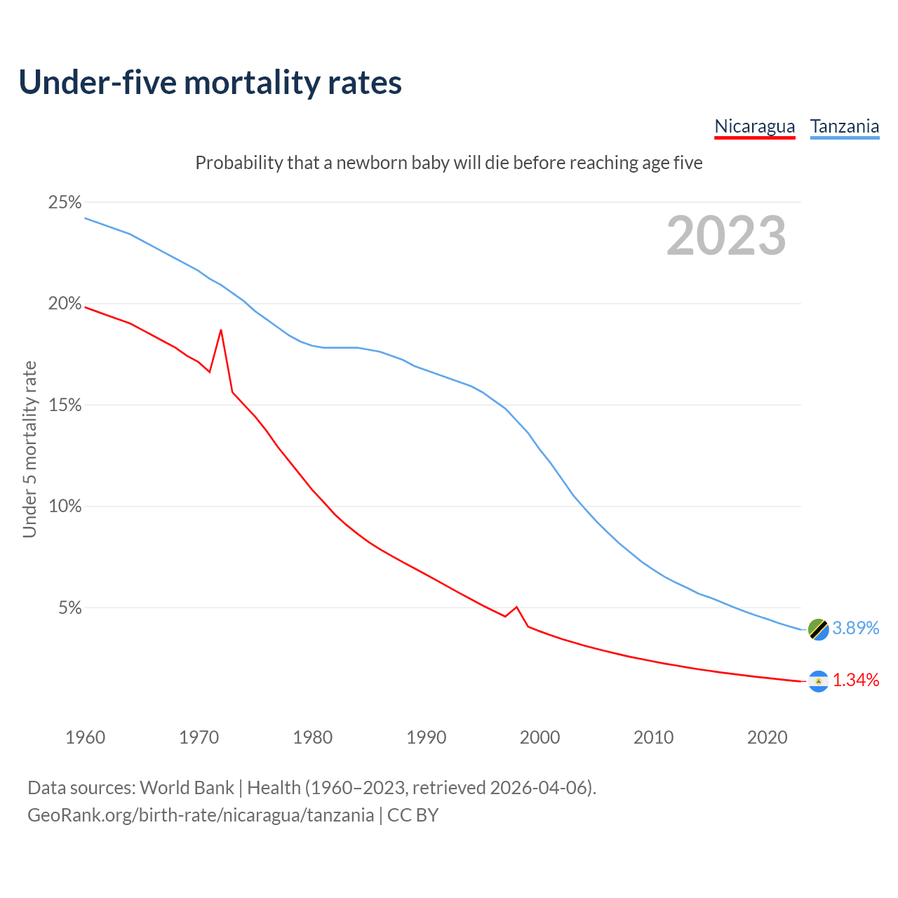 The chance that a newborn baby will die before reaching age five is 1.34% in Nicaragua and 3.89% in Tanzania. Above is a chart with historical data on under-five mortality rates.