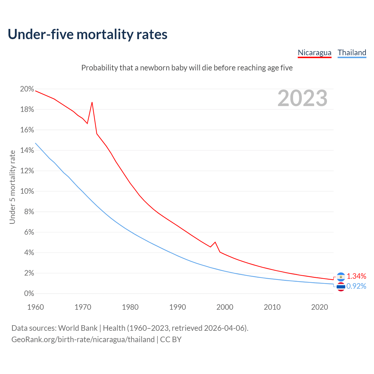 The chance that a newborn baby will die before reaching age five is 1.34% in Nicaragua and 0.92% in Thailand. Above is a chart with historical data on under-five mortality rates.