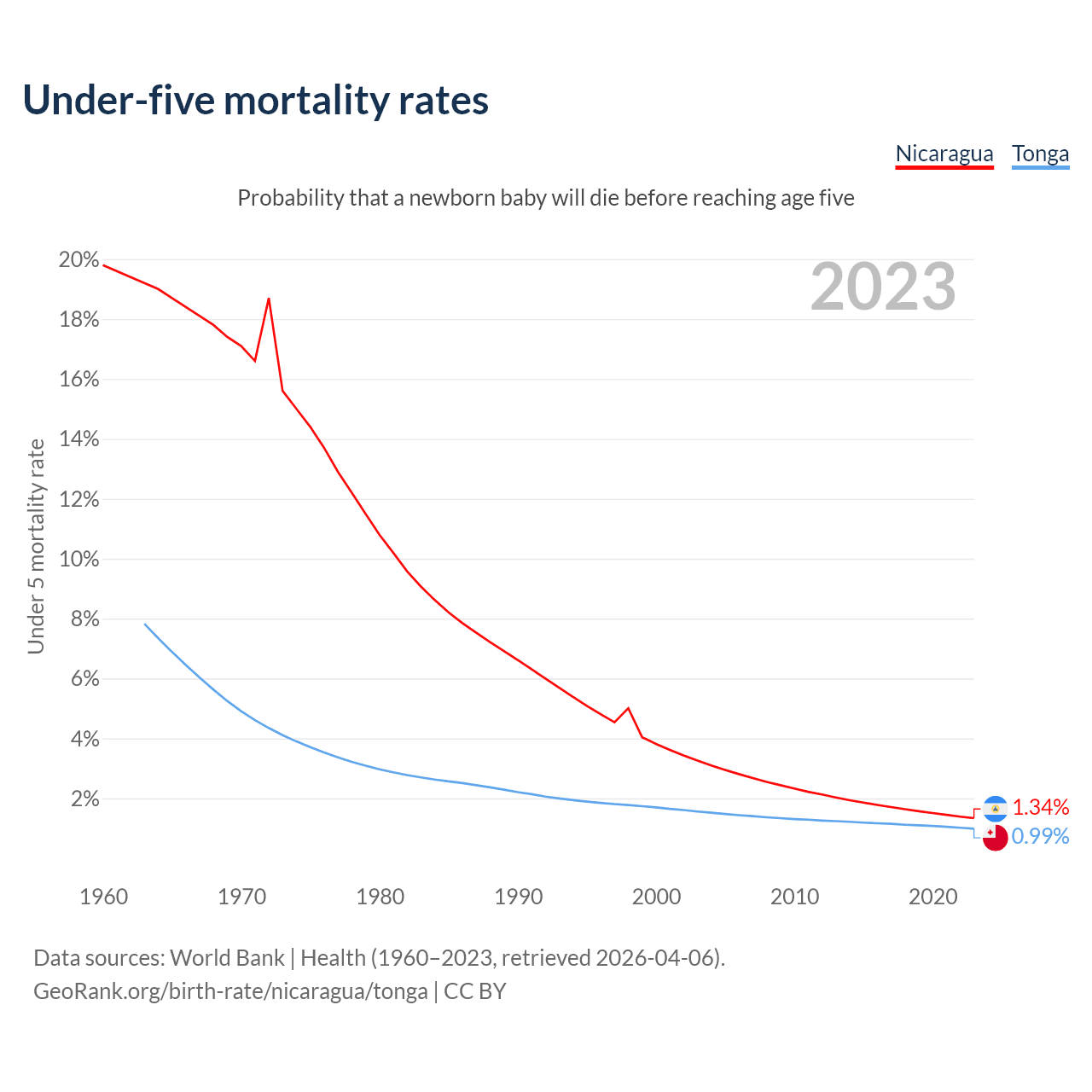 The chance that a newborn baby will die before reaching age five is 1.34% in Nicaragua and 0.99% in Tonga. Above is a chart with historical data on under-five mortality rates.