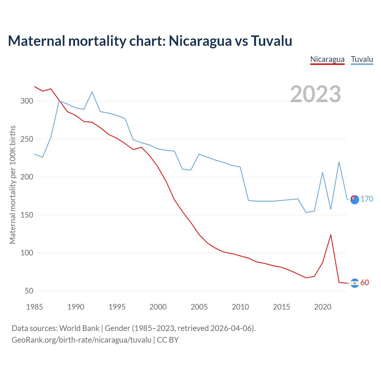 The maternal mortality rate, which is the probability of dying during childbirth or within 42 days of pregnancy termination, is 60 deaths per 100,000 live births in Nicaragua, compared to 170 deaths in Tuvalu.