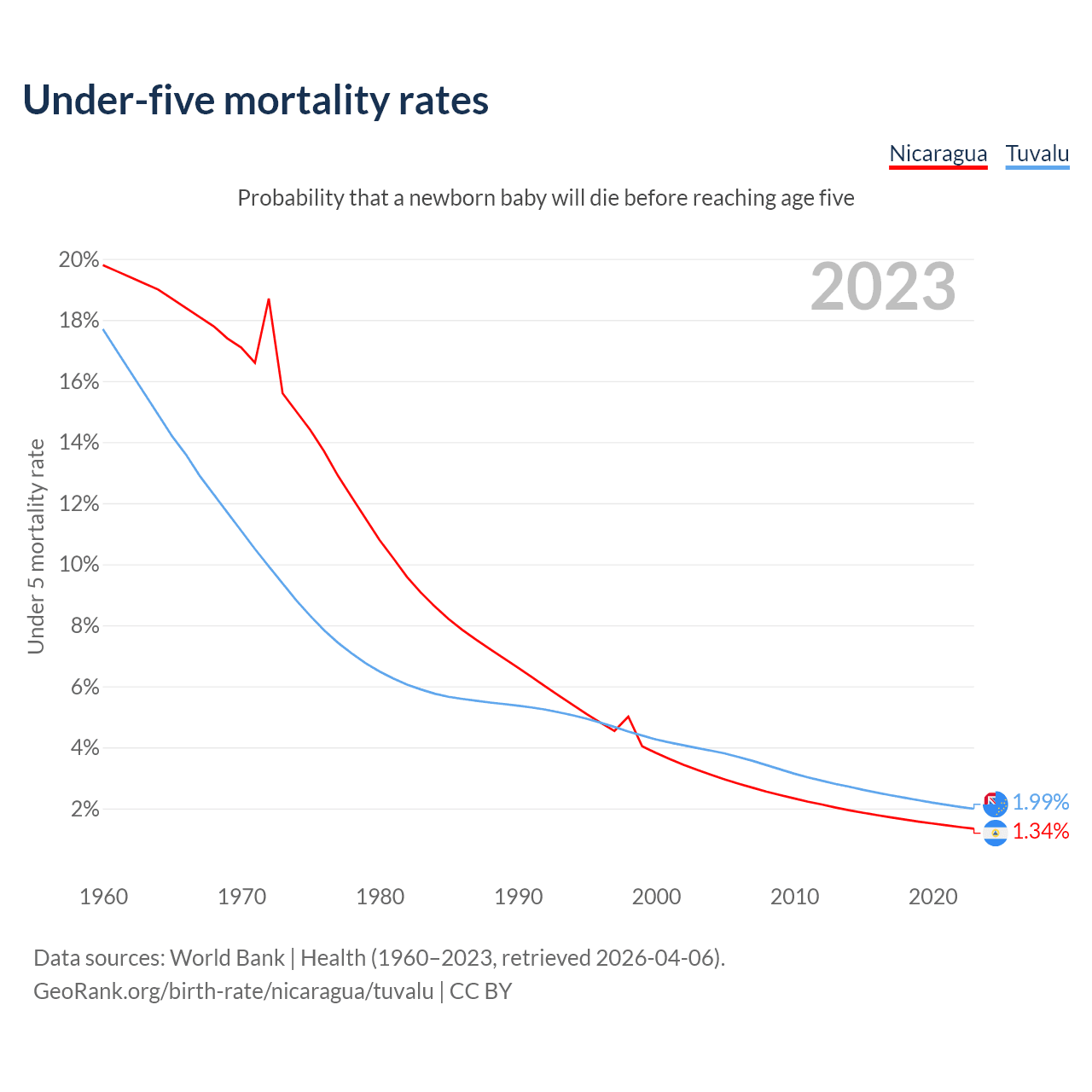 The chance that a newborn baby will die before reaching age five is 1.34% in Nicaragua and 1.99% in Tuvalu. Above is a chart with historical data on under-five mortality rates.