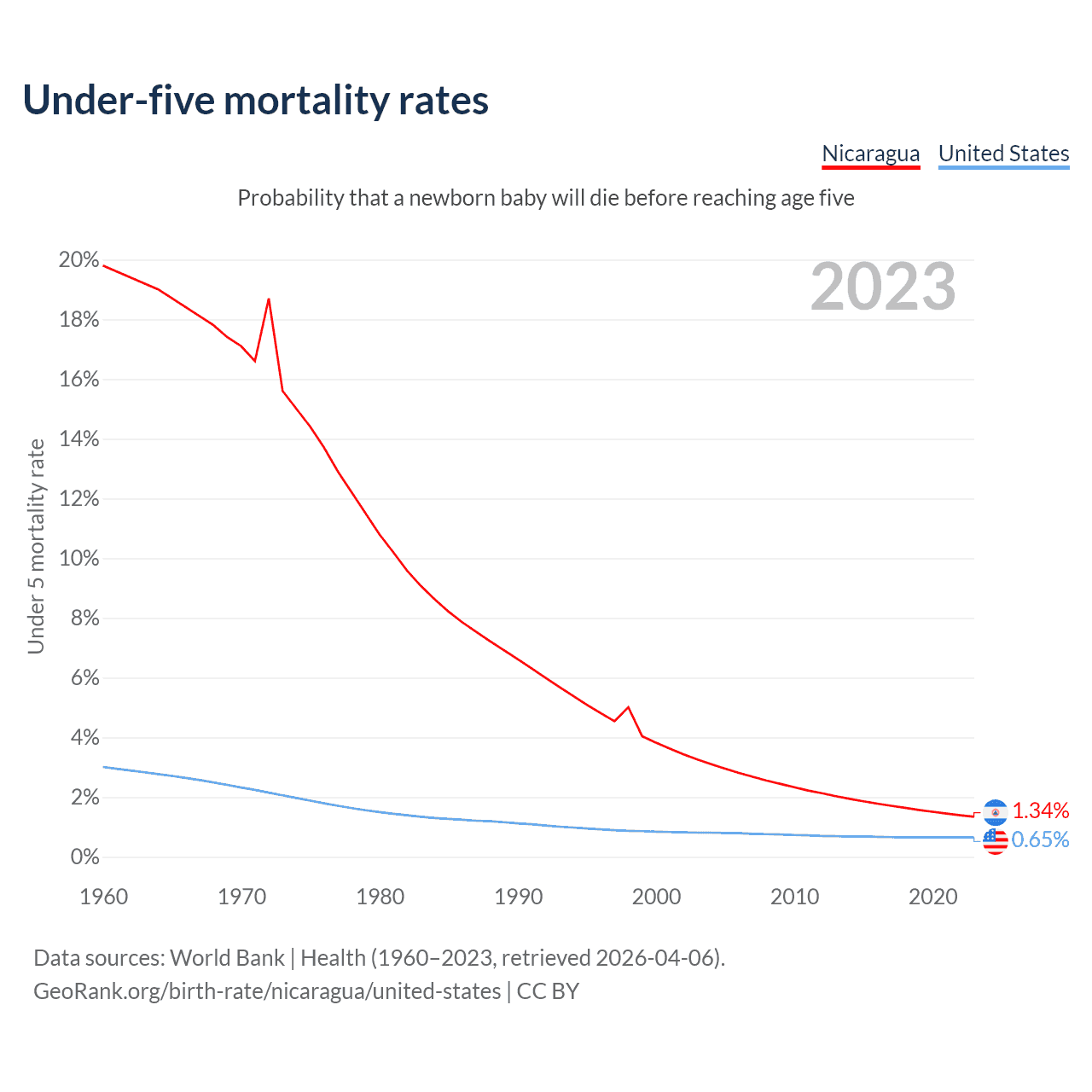 The chance that a newborn baby will die before reaching age five is 1.34% in Nicaragua and 0.65% in the United States. Above is a chart with historical data on under-five mortality rates.