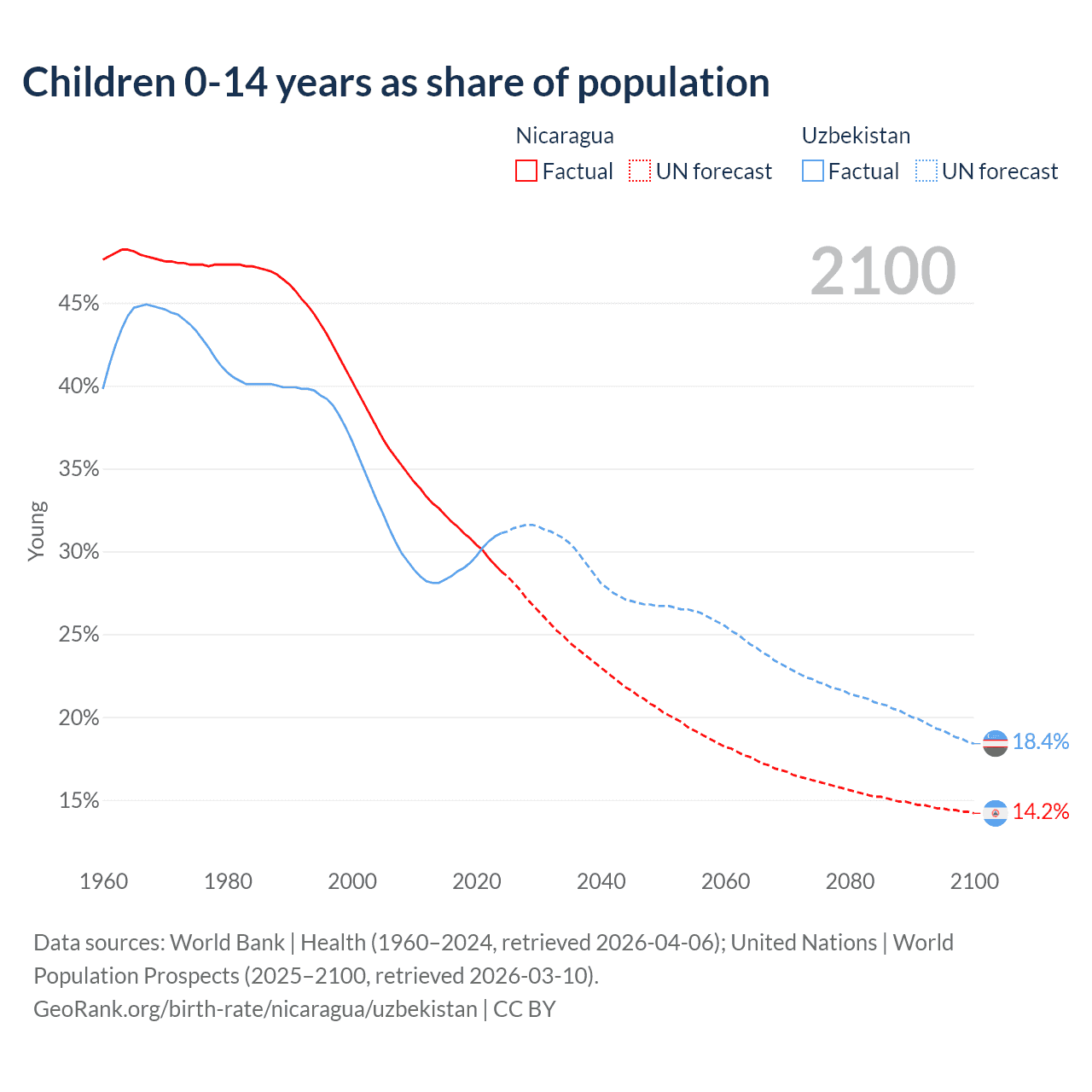 According to the latest available data on birth rates, the fertility rate in Nicaragua was 2.22 children per woman in 2023, compared to 3.5 in Uzbekistan in 2023. The replacement level is considered to be 2.1 children per woman.