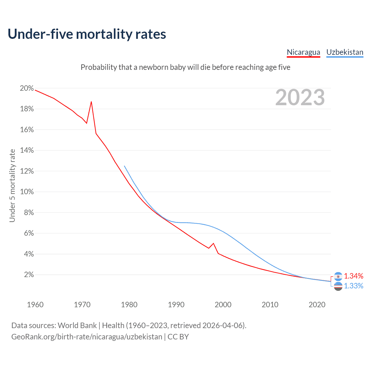 The chance that a newborn baby will die before reaching age five is 1.34% in Nicaragua and 1.33% in Uzbekistan. Above is a chart with historical data on under-five mortality rates.