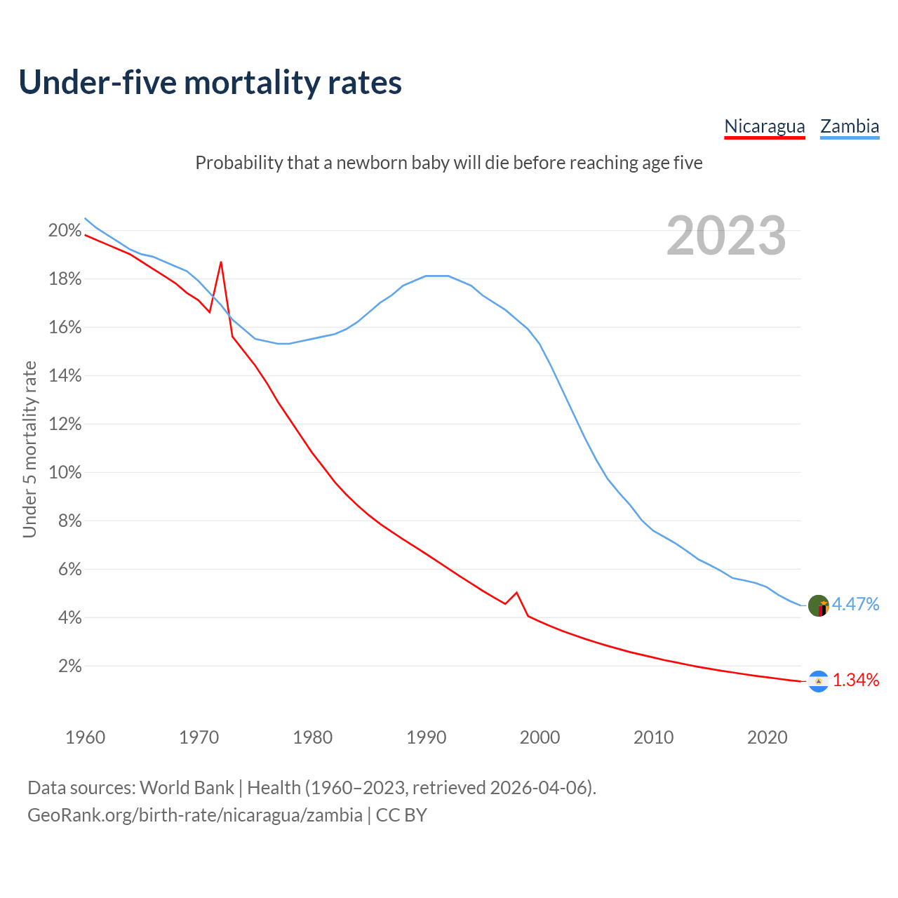 The chance that a newborn baby will die before reaching age five is 1.34% in Nicaragua and 4.47% in Zambia. Above is a chart with historical data on under-five mortality rates.