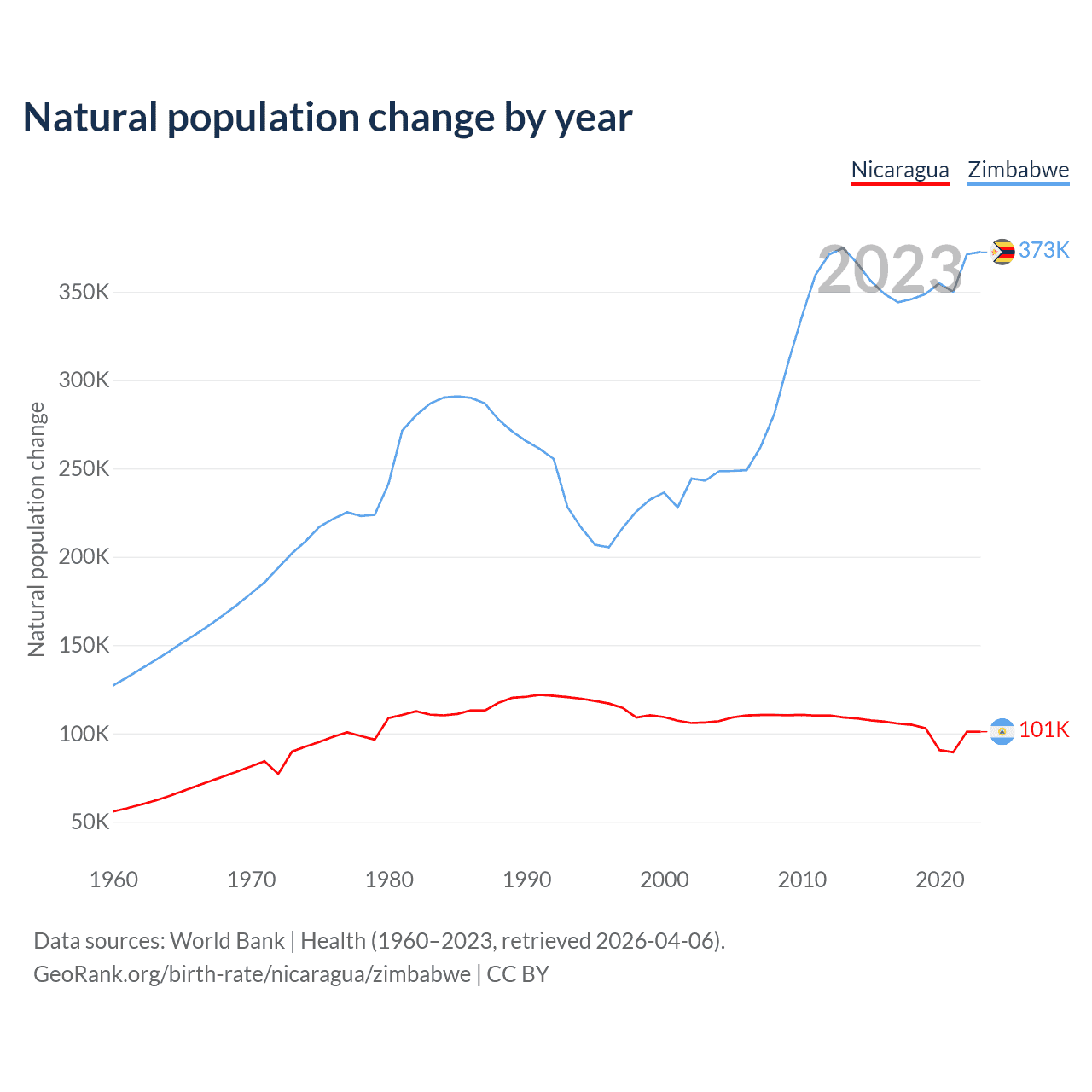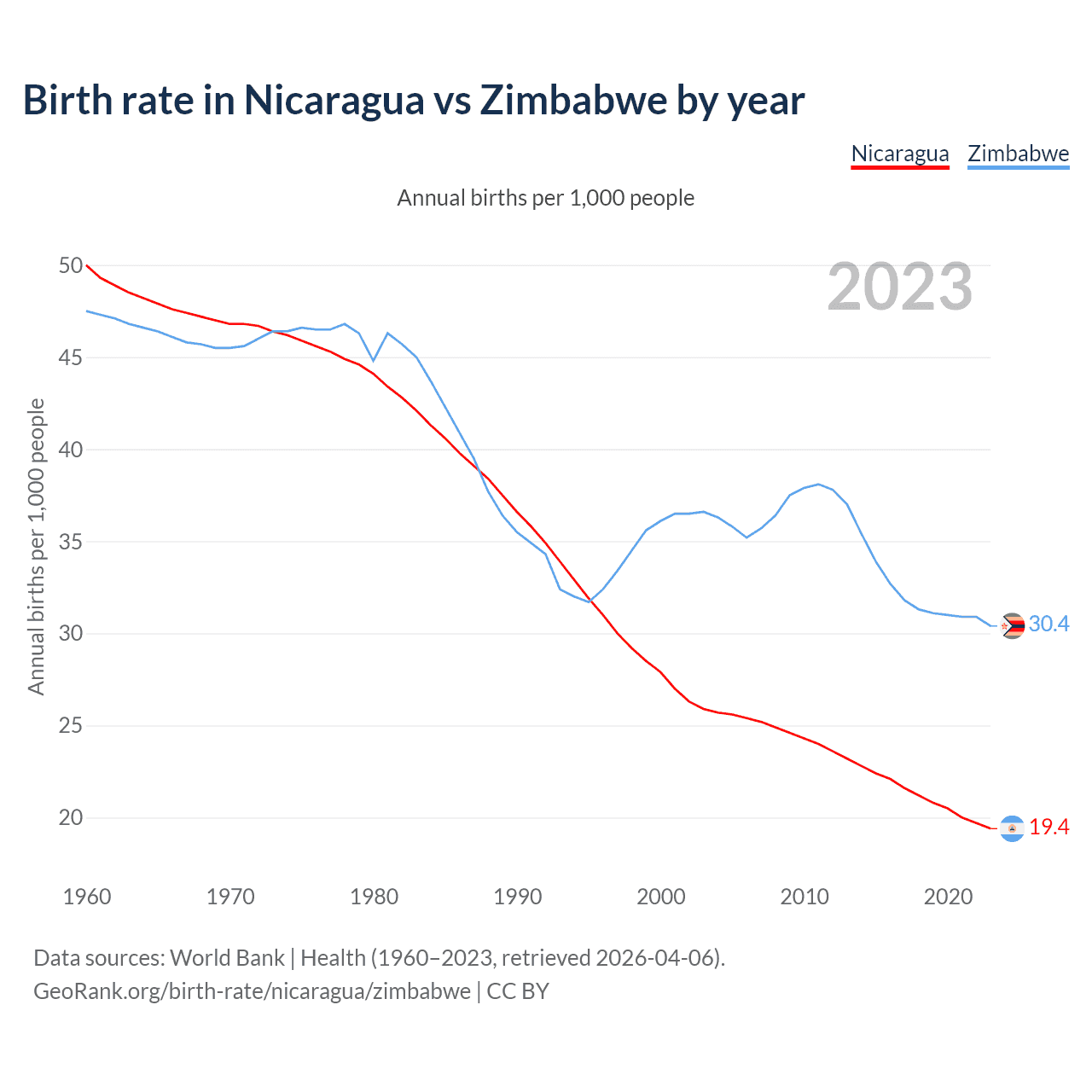 Nicaragua has an annual birth rate of 19.4 births per 1,000 people, compared to 30.4 for Zimbabwe. The average number of children a woman is expected to have during her lifetime — the fertility rate, is 2.22 in Nicaragua and 3.72 in Zimbabwe — 67.9% difference.