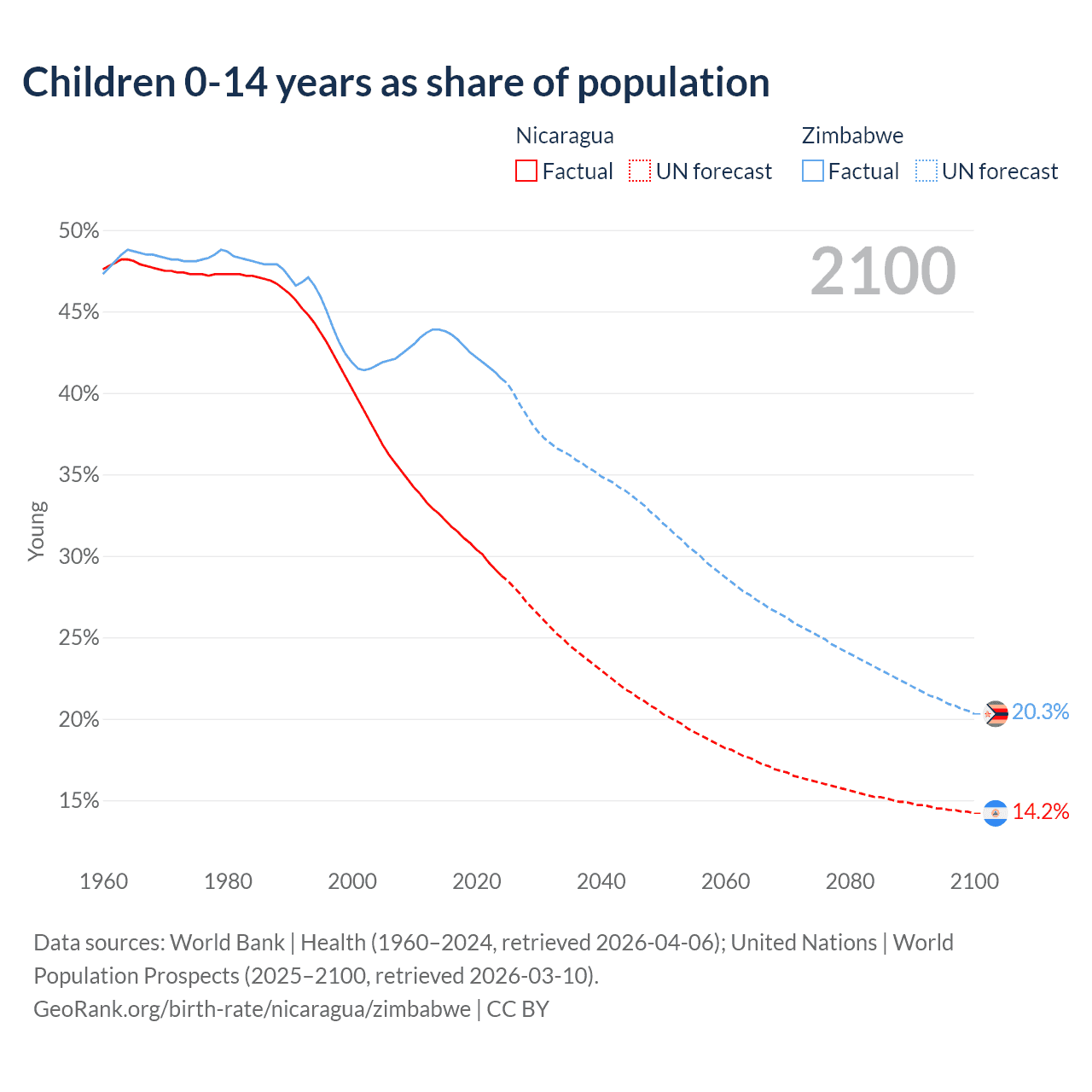 According to the latest available data on birth rates, the fertility rate in Nicaragua was 2.22 children per woman in 2023, compared to 3.72 in Zimbabwe in 2023. The replacement level is considered to be 2.1 children per woman.