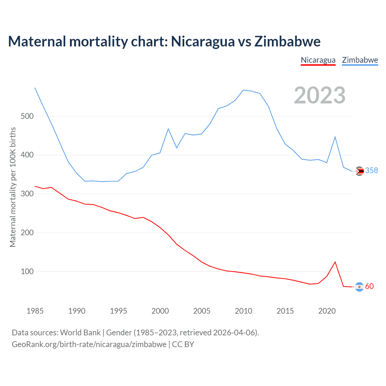 - Annual births per 1,000 women ages 15-19 (adolescent birth rate or teenage mother rate) is 93.5 in Nicaragua vs 98.1 in Zimbabwe.