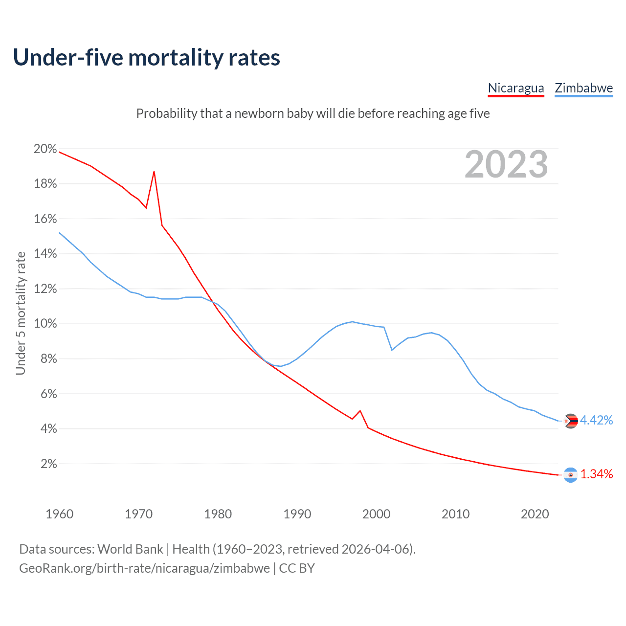 The chance that a newborn baby will die before reaching age five is 1.34% in Nicaragua and 4.42% in Zimbabwe. Above is a chart with historical data on under-five mortality rates.