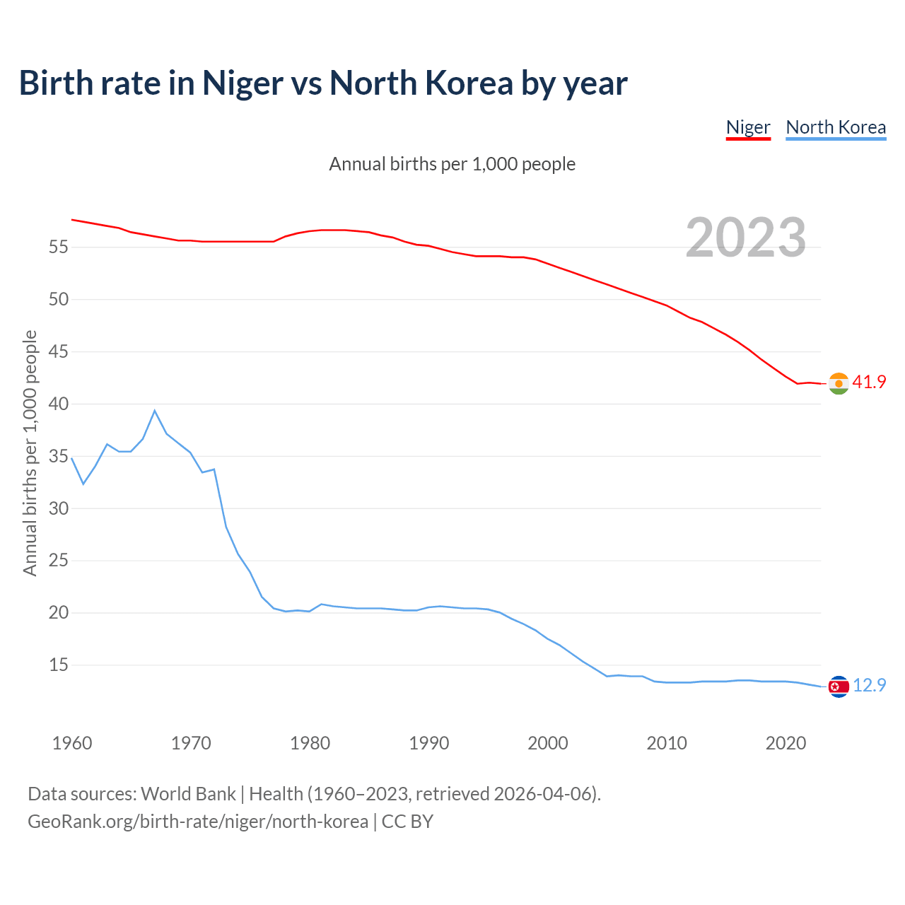 Niger has an annual birth rate of 41.9 births per 1,000 people, compared to 12.9 for North Korea. The average number of children a woman is expected to have during her lifetime — the fertility rate, is 6.06 in Niger and 1.78 in North Korea — 70.6% difference.