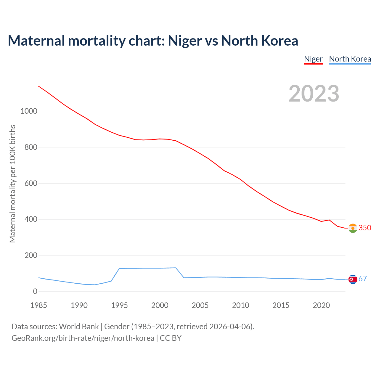 The maternal mortality rate, which is the probability of dying during childbirth or within 42 days of pregnancy termination, is 350 deaths per 100,000 live births in Niger, compared to 67 deaths in North Korea.