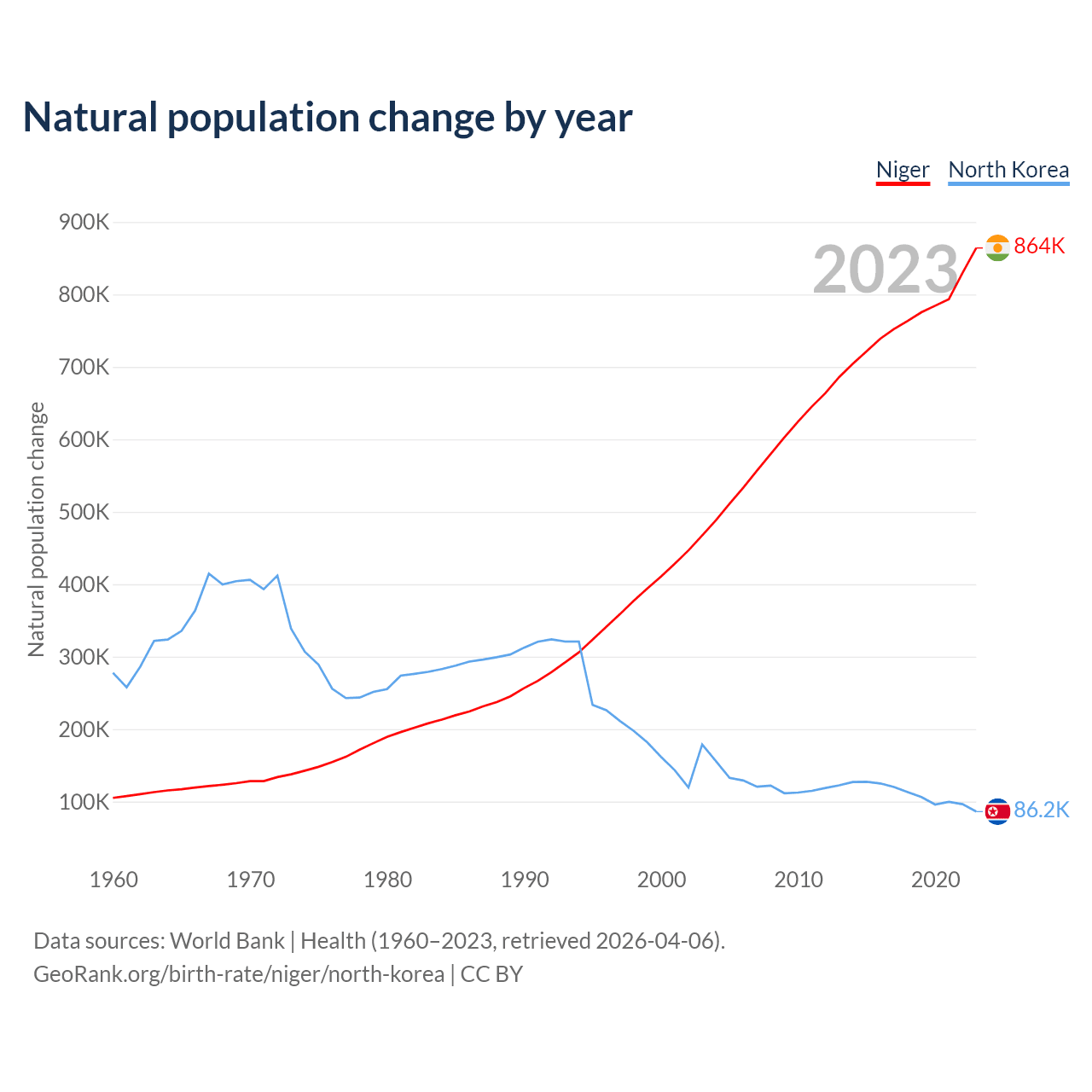 According to the latest available data on birth rates, the fertility rate in Niger was 6.06 children per woman in 2023, compared to 1.78 in North Korea in 2023. The replacement level is considered to be 2.1 children per woman.