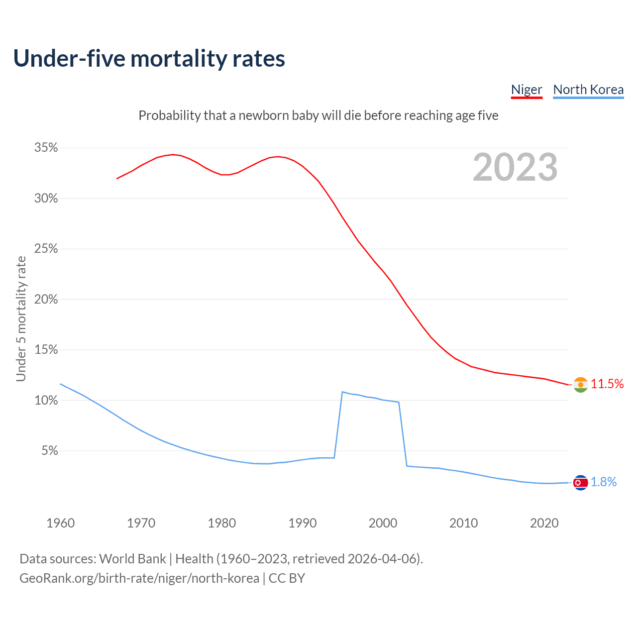 The chance that a newborn baby will die before reaching age five is 11.5% in Niger and 1.8% in North Korea. Above is a chart with historical data on under-five mortality rates.