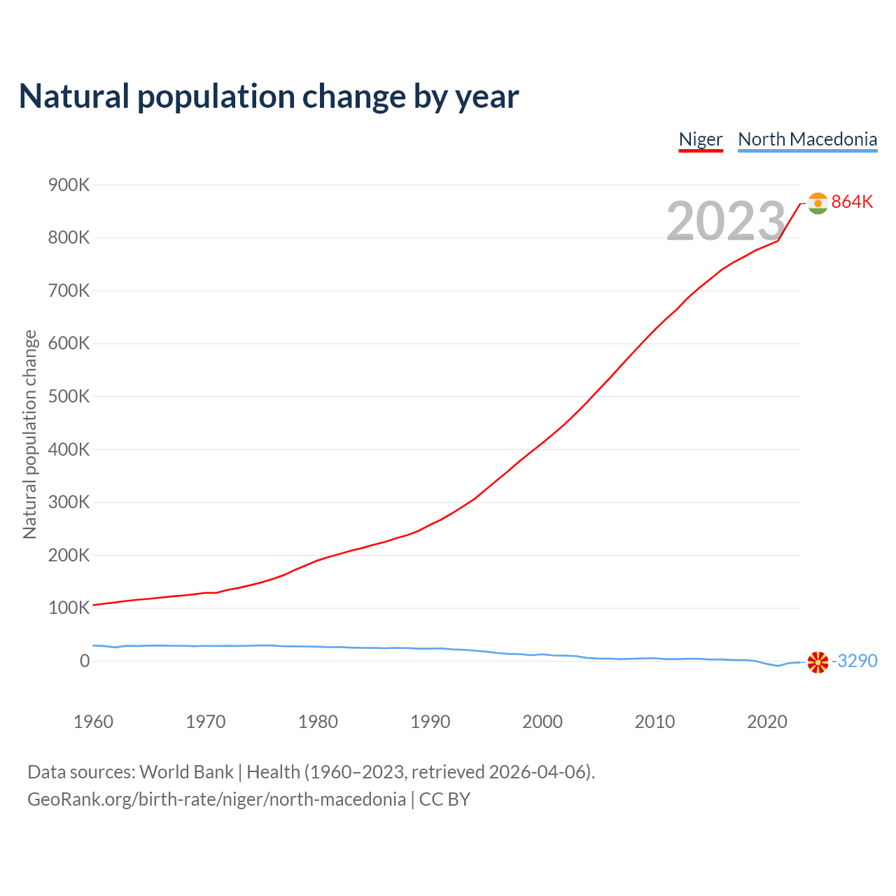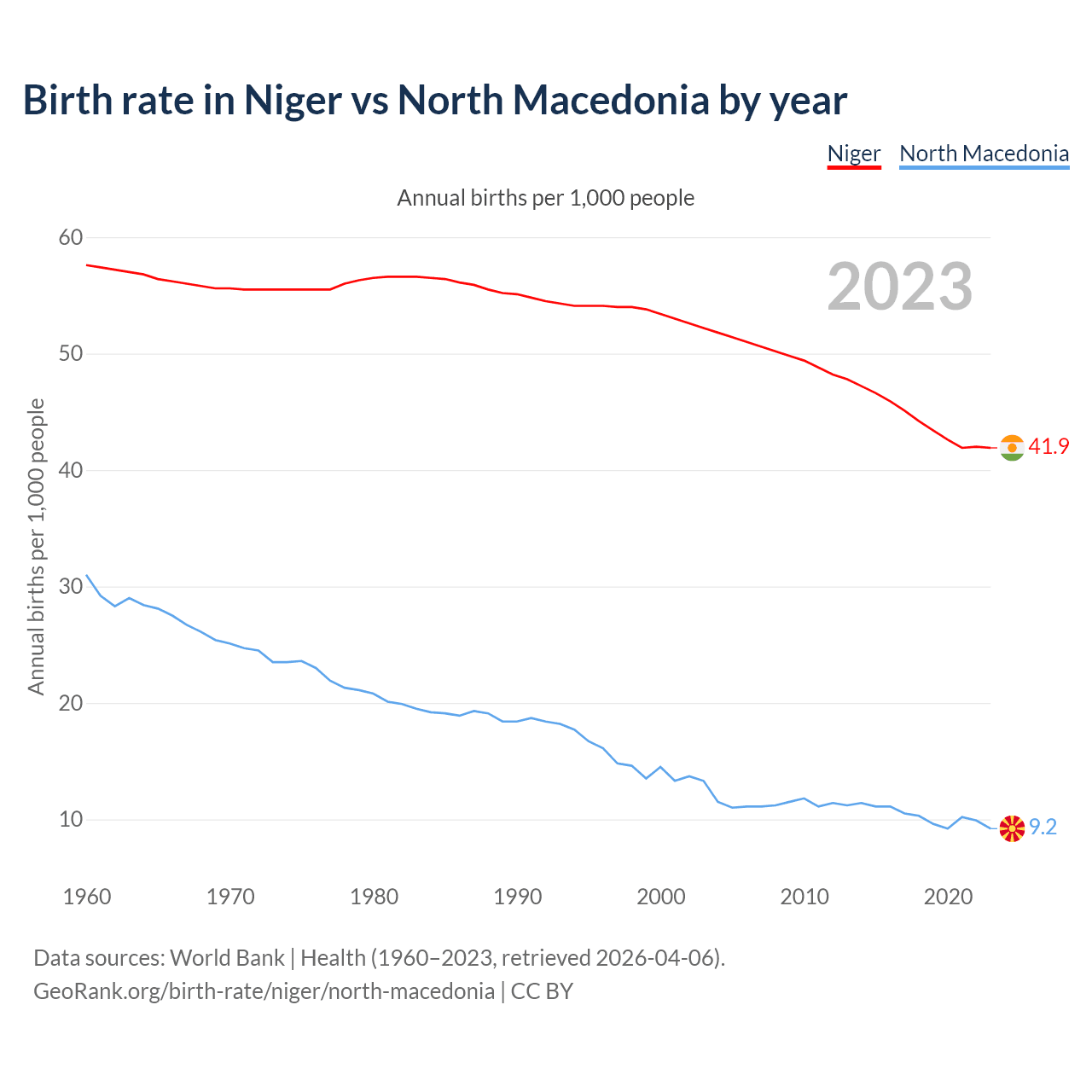 Niger has an annual birth rate of 41.9 births per 1,000 people, compared to 9.2 for North Macedonia. The average number of children a woman is expected to have during her lifetime — the fertility rate, is 6.06 in Niger and 1.5 in North Macedonia — 75.3% difference.