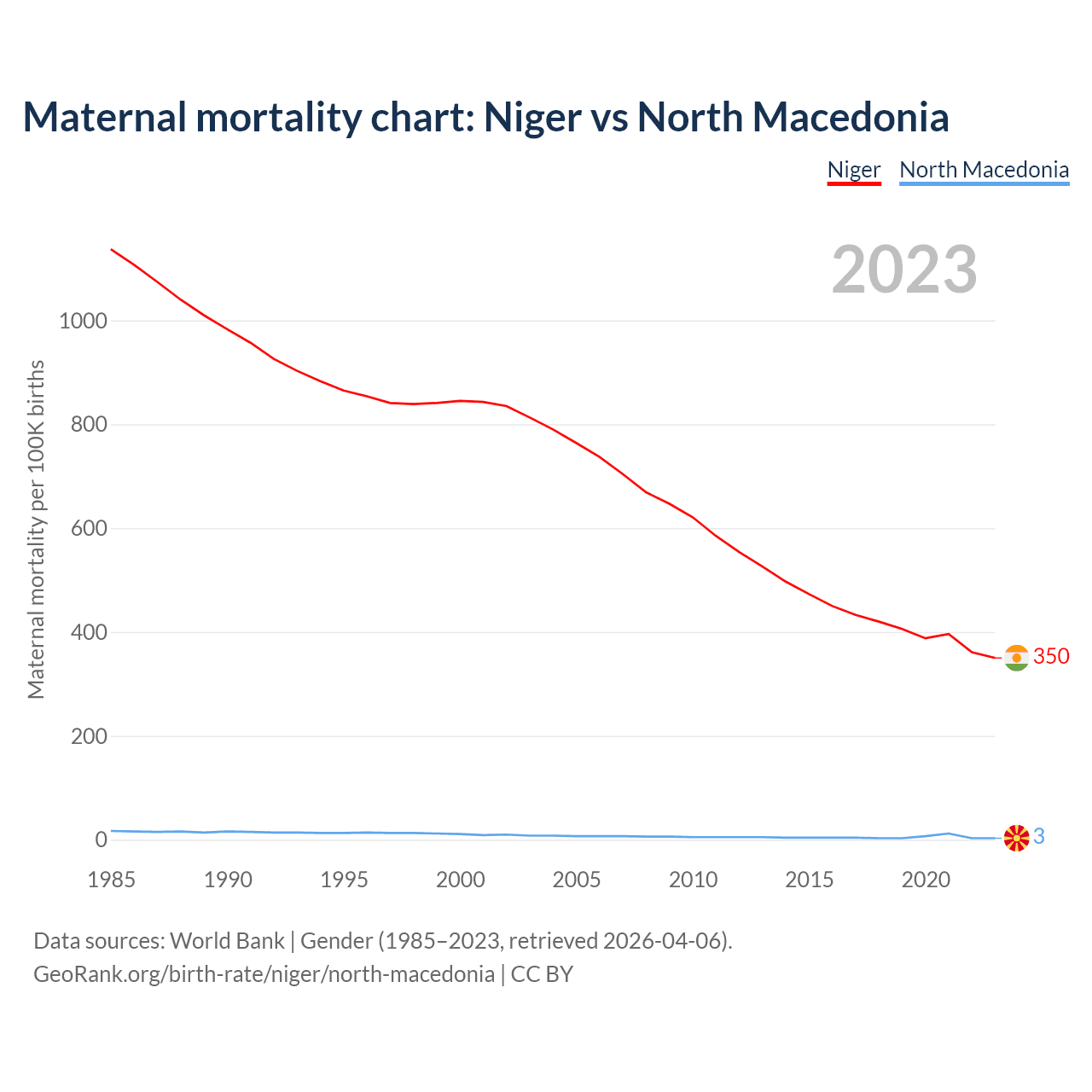 The maternal mortality rate, which is the probability of dying during childbirth or within 42 days of pregnancy termination, is 350 deaths per 100,000 live births in Niger, compared to 3 deaths in North Macedonia.