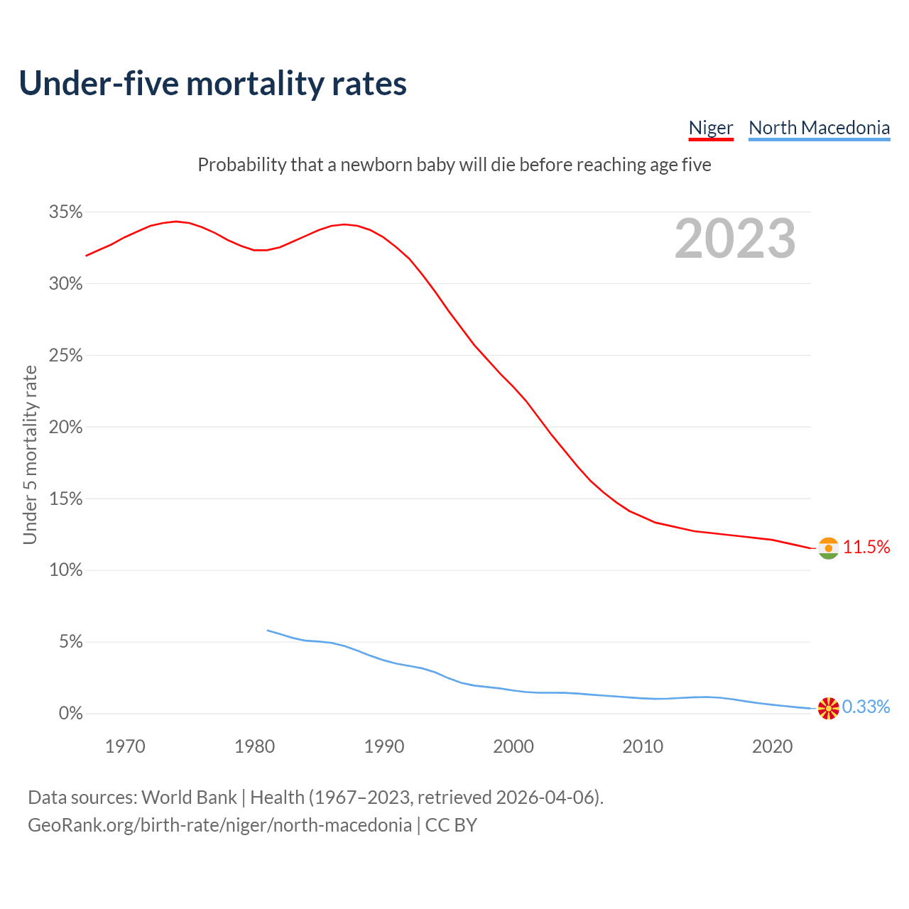 The chance that a newborn baby will die before reaching age five is 11.5% in Niger and 0.33% in North Macedonia. Above is a chart with historical data on under-five mortality rates.