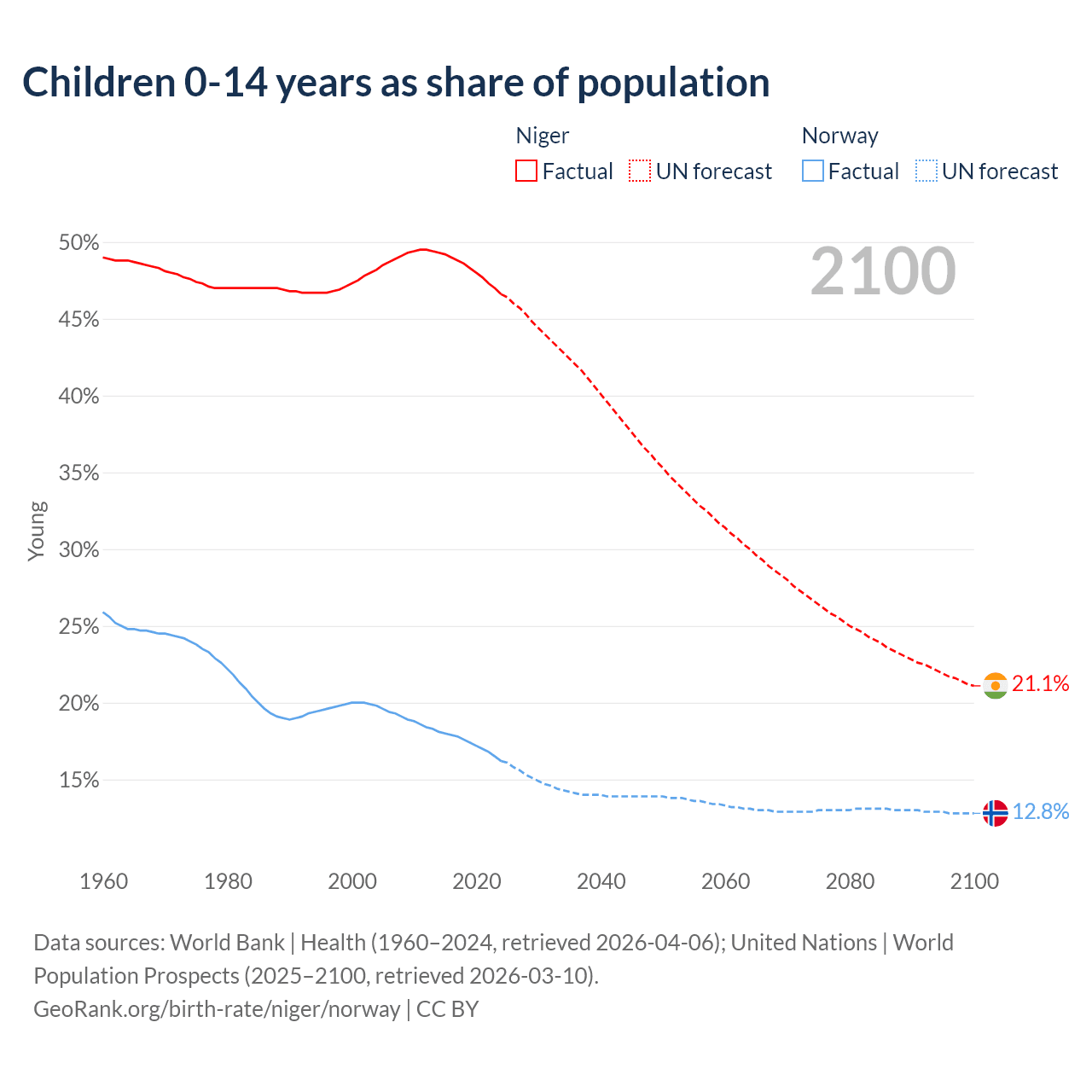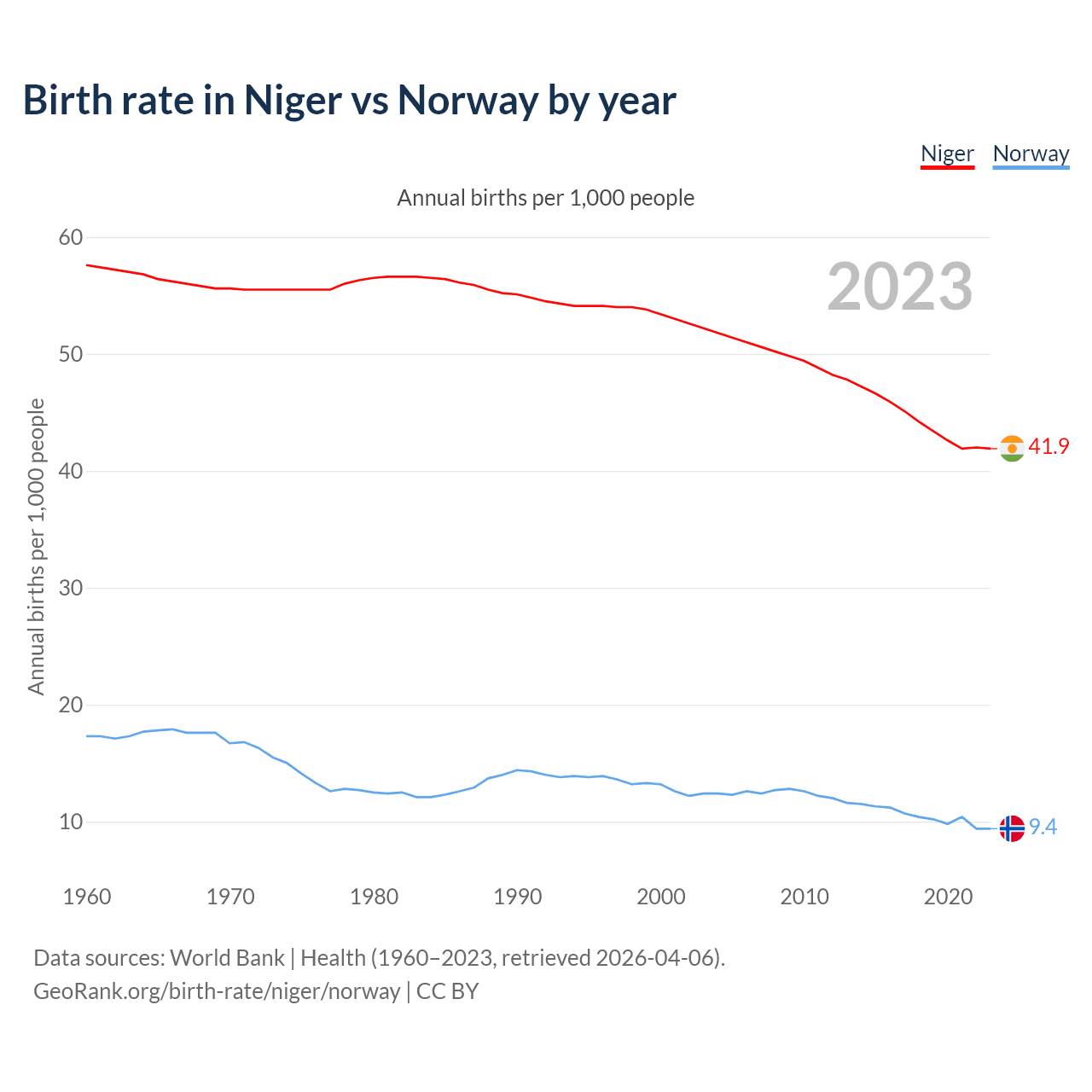 According to the latest available data on birth rates, the fertility rate in Niger was 6.06 children per woman in 2023, compared to 1.4 in Norway in 2023. The replacement level is considered to be 2.1 children per woman.