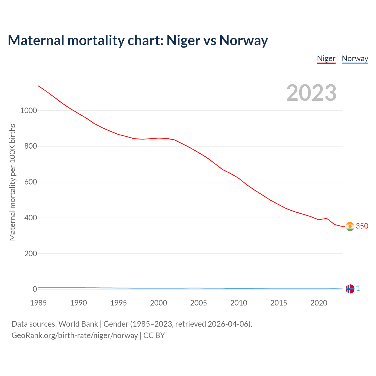 The maternal mortality rate, which is the probability of dying during childbirth or within 42 days of pregnancy termination, is 350 deaths per 100,000 live births in Niger, compared to 1 deaths in Norway.
