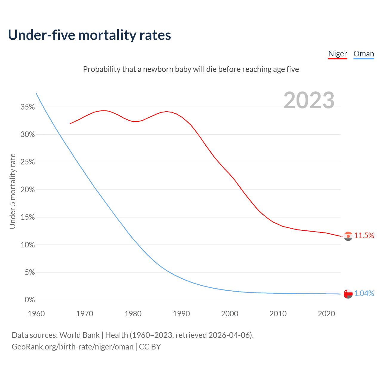 The chance that a newborn baby will die before reaching age five is 11.5% in Niger and 1.04% in Oman. Above is a chart with historical data on under-five mortality rates.