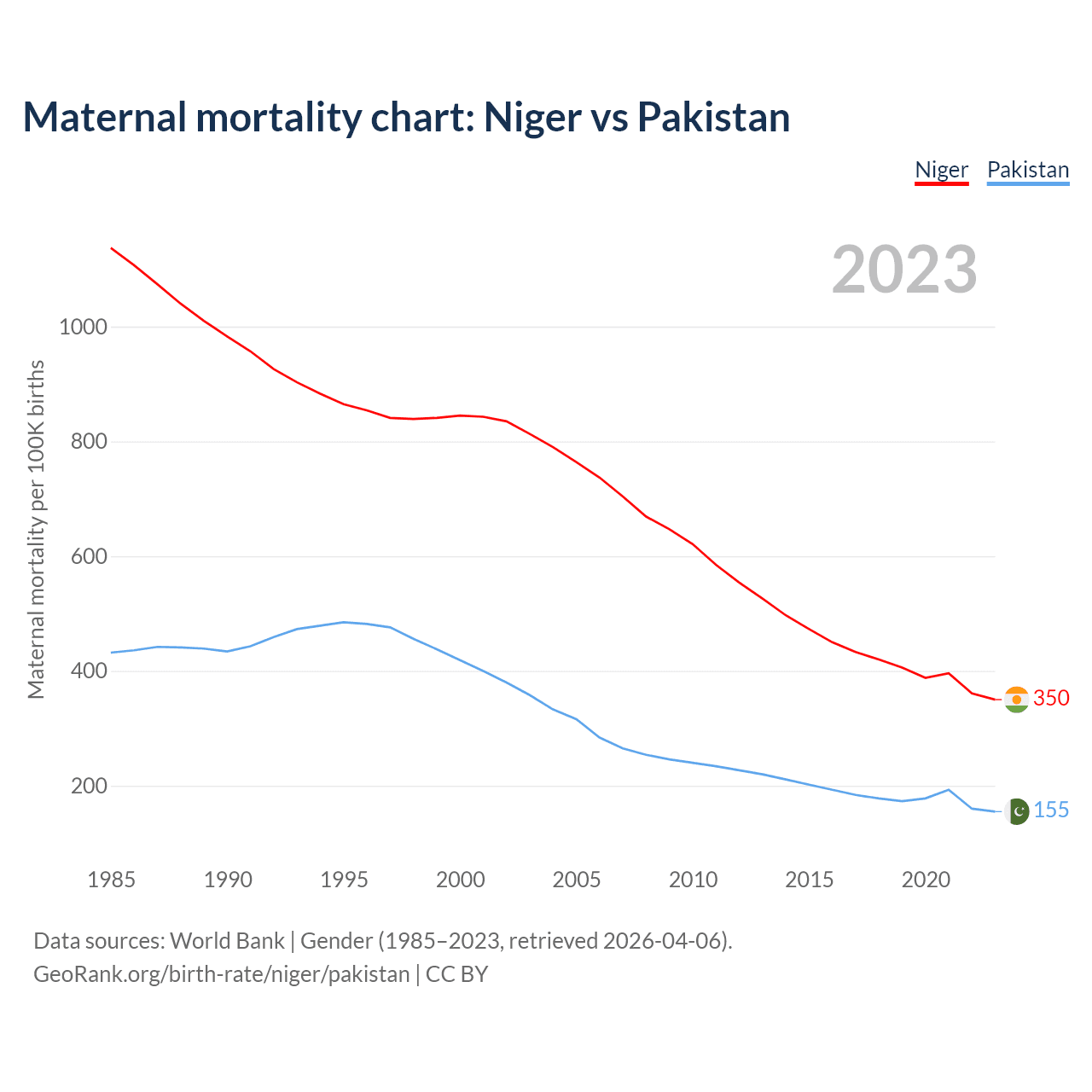 The maternal mortality rate, which is the probability of dying during childbirth or within 42 days of pregnancy termination, is 350 deaths per 100,000 live births in Niger, compared to 155 deaths in Pakistan.