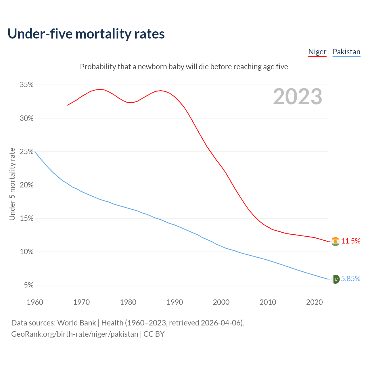 The chance that a newborn baby will die before reaching age five is 11.5% in Niger and 5.85% in Pakistan. Above is a chart with historical data on under-five mortality rates.
