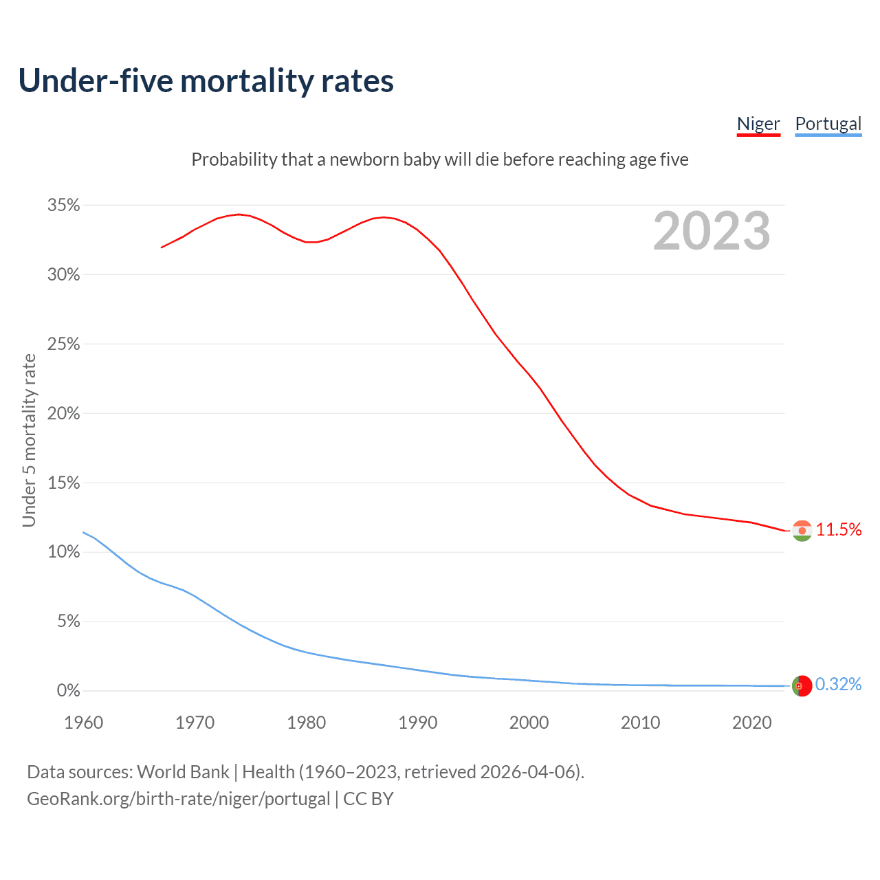 The chance that a newborn baby will die before reaching age five is 11.5% in Niger and 0.32% in Portugal. Above is a chart with historical data on under-five mortality rates.