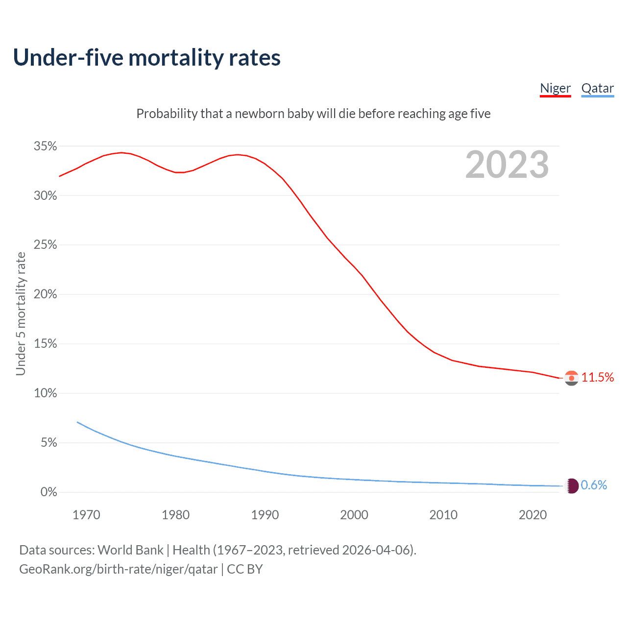 The chance that a newborn baby will die before reaching age five is 11.5% in Niger and 0.6% in Qatar. Above is a chart with historical data on under-five mortality rates.