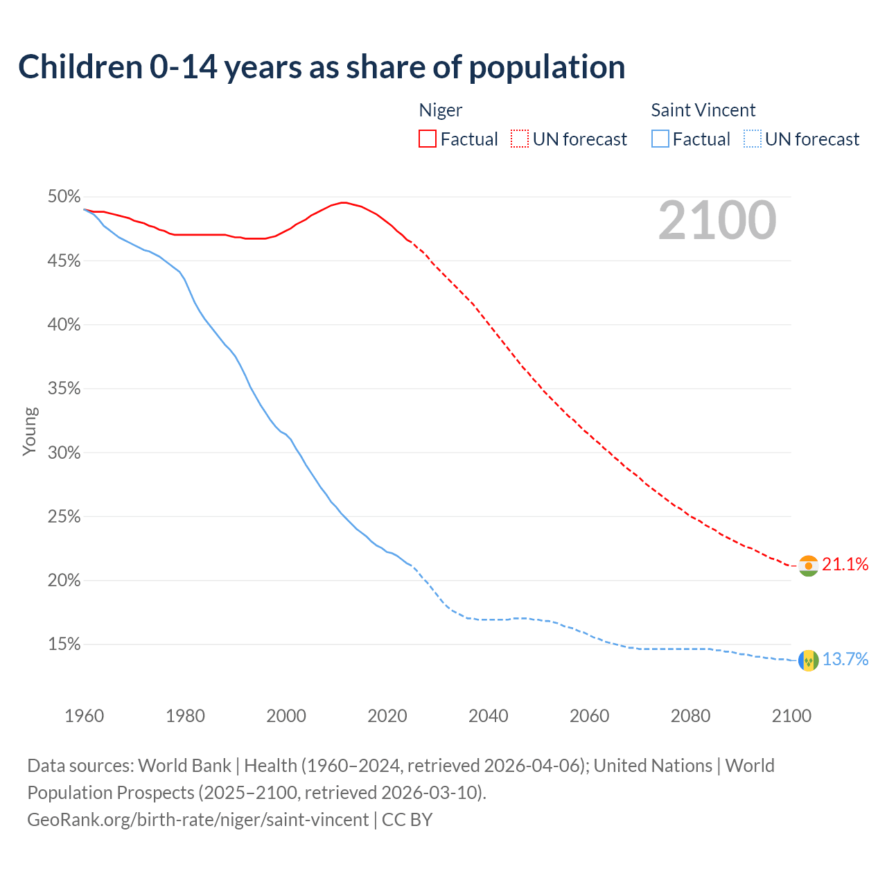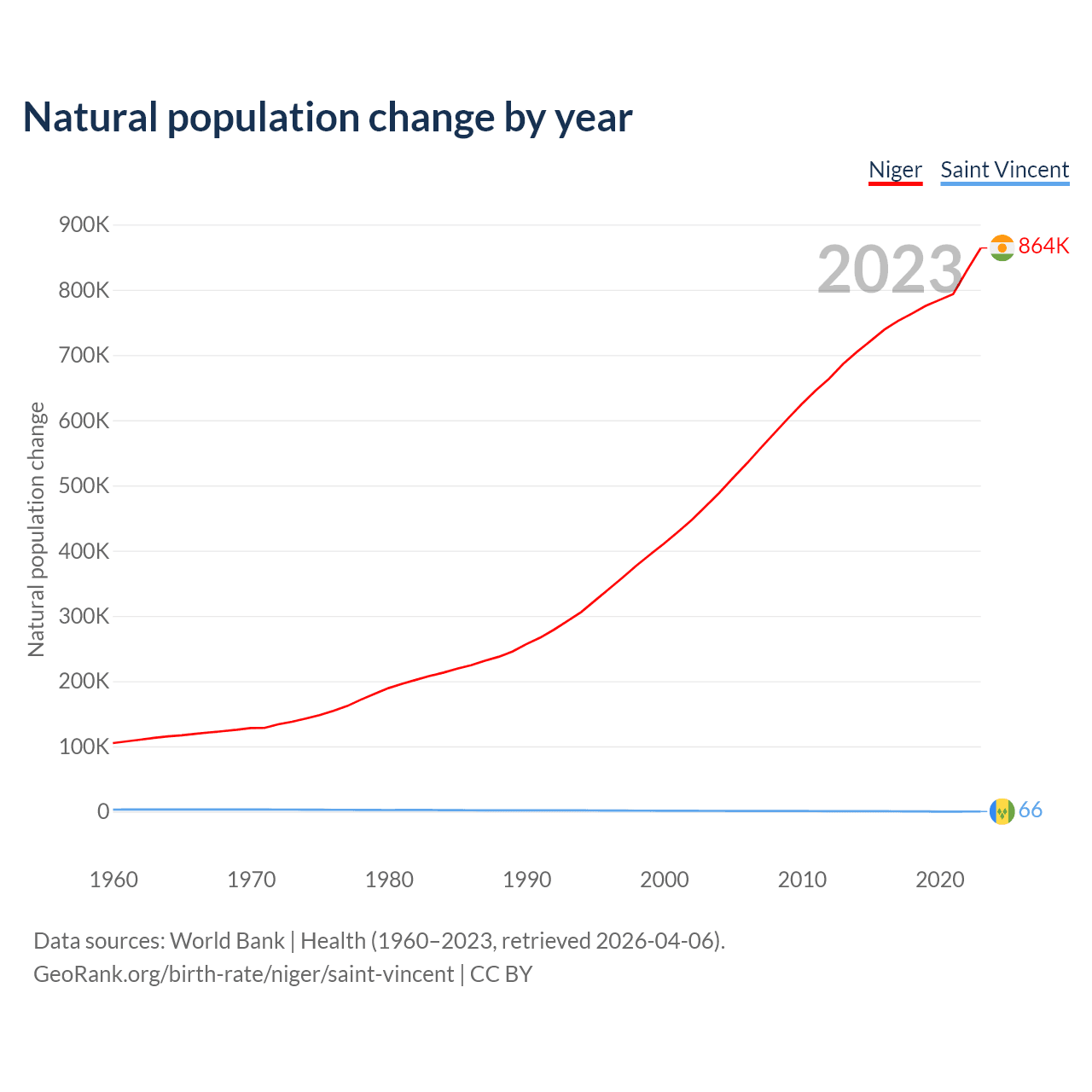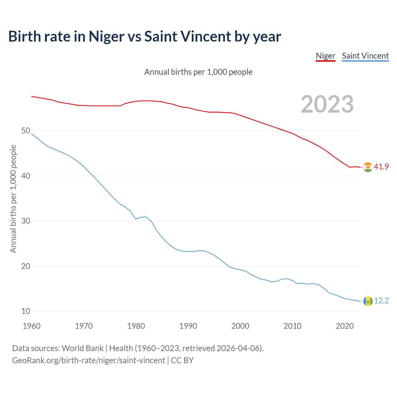 Niger has an annual birth rate of 41.9 births per 1,000 people, compared to 12.2 for Saint Vincent. The average number of children a woman is expected to have during her lifetime — the fertility rate, is 6.06 in Niger and 1.78 in Saint Vincent — 70.7% difference.