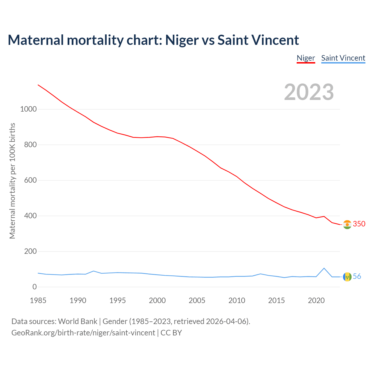 The maternal mortality rate, which is the probability of dying during childbirth or within 42 days of pregnancy termination, is 350 deaths per 100,000 live births in Niger, compared to 56 deaths in Saint Vincent.
