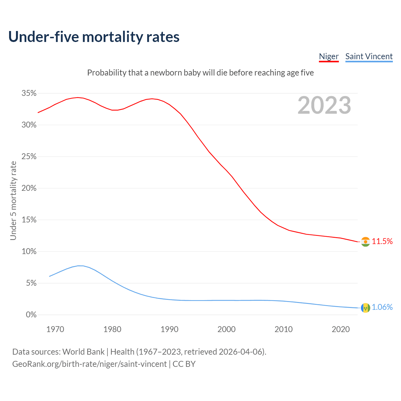 The chance that a newborn baby will die before reaching age five is 11.5% in Niger and 1.06% in Saint Vincent. Above is a chart with historical data on under-five mortality rates.