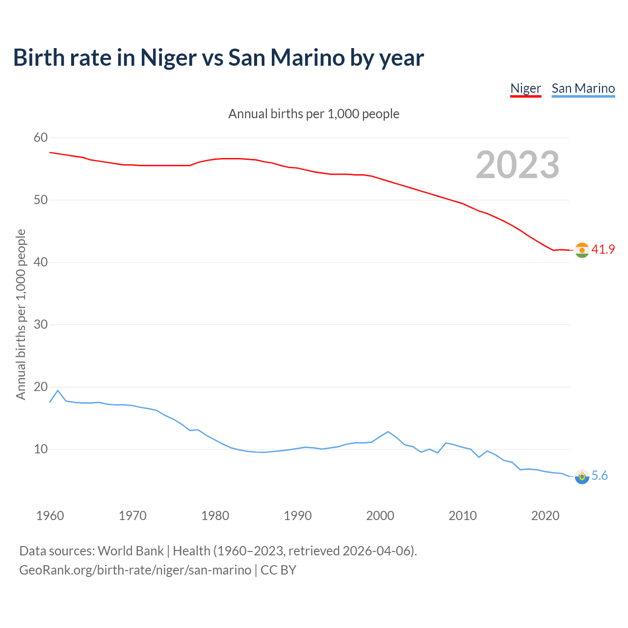Niger has an annual birth rate of 41.9 births per 1,000 people, compared to 5.6 for San Marino. The average number of children a woman is expected to have during her lifetime — the fertility rate, is 6.06 in Niger and 1.15 in San Marino — 81% difference.