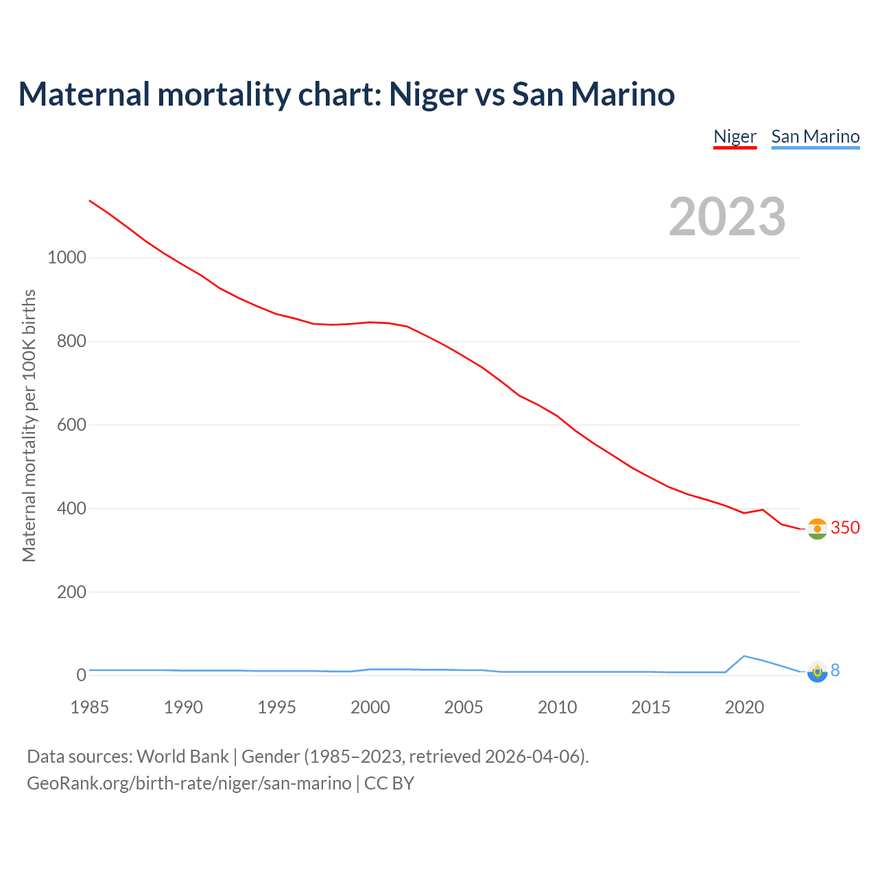 The maternal mortality rate, which is the probability of dying during childbirth or within 42 days of pregnancy termination, is 350 deaths per 100,000 live births in Niger, compared to 8 deaths in San Marino.