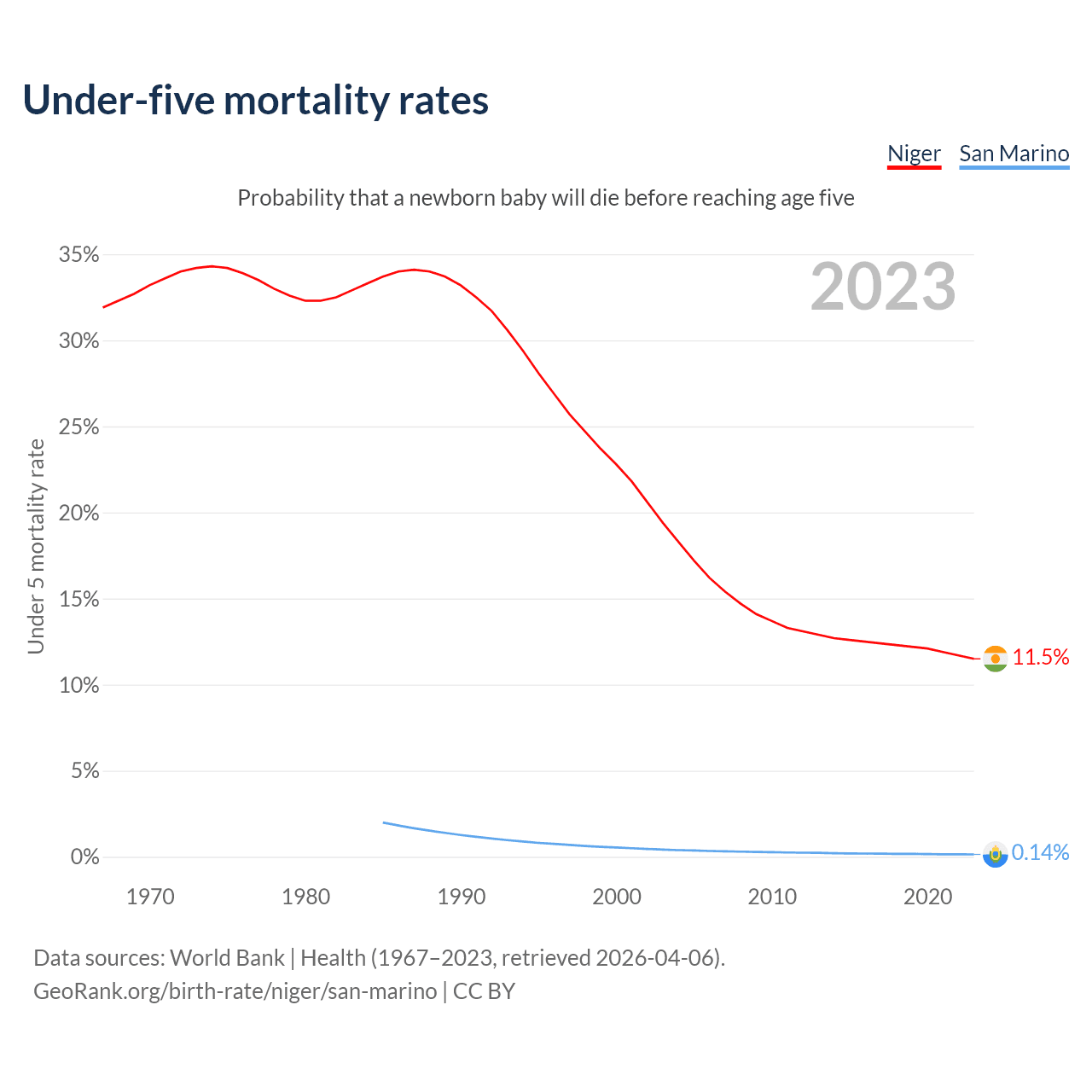The chance that a newborn baby will die before reaching age five is 11.5% in Niger and 0.14% in San Marino. Above is a chart with historical data on under-five mortality rates.