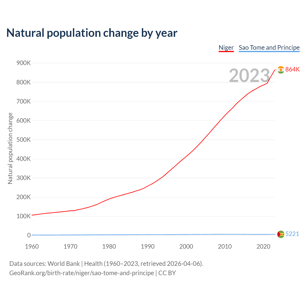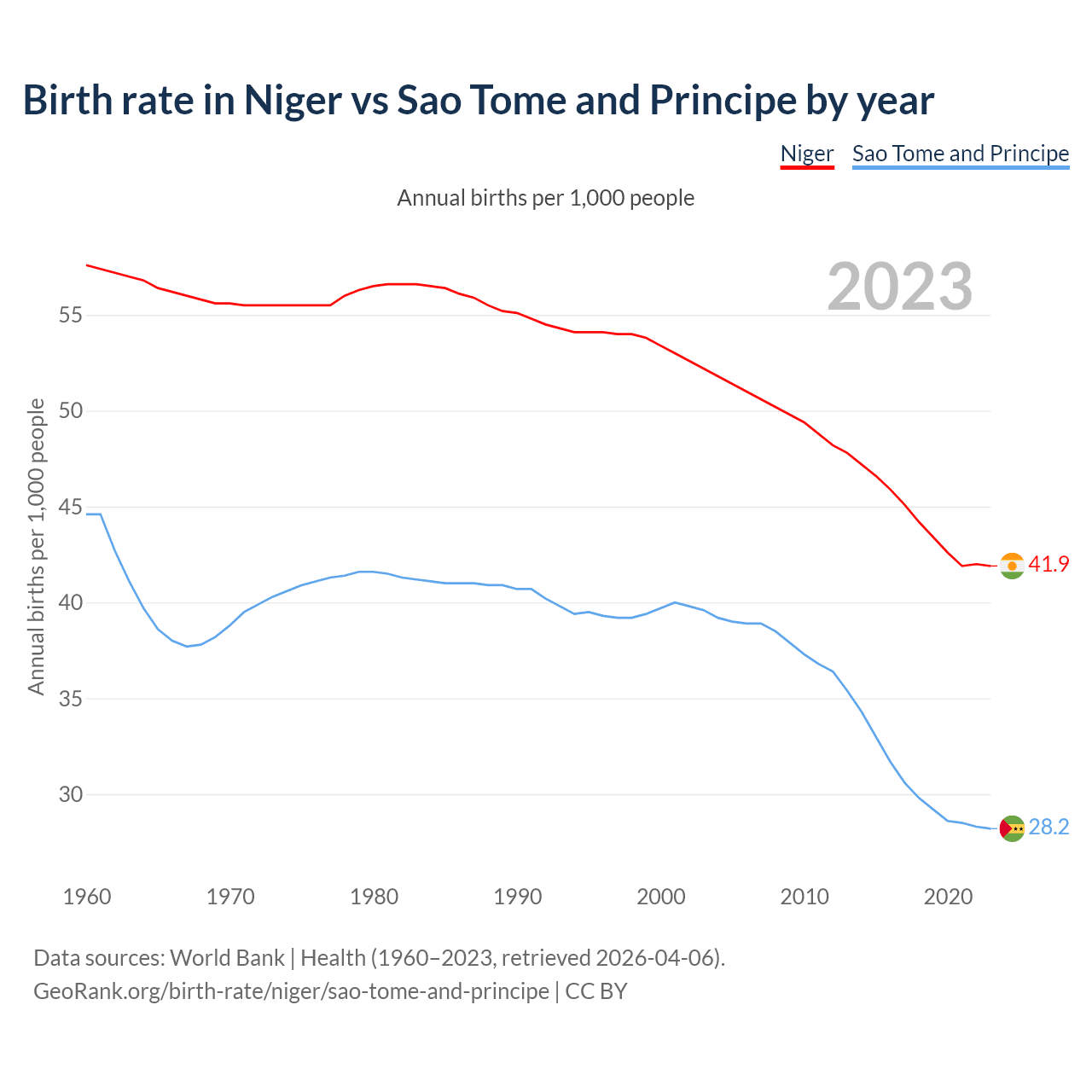 Niger has an annual birth rate of 41.9 births per 1,000 people, compared to 28.2 for Sao Tome and Principe. The average number of children a woman is expected to have during her lifetime — the fertility rate, is 6.06 in Niger and 3.64 in Sao Tome and Principe — 39.9% difference.