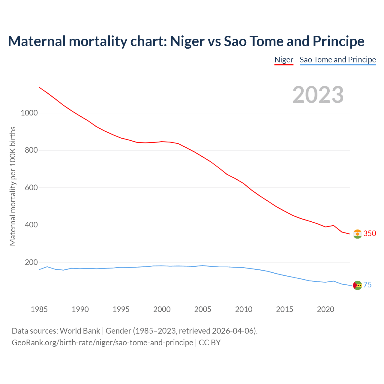 - Annual births per 1,000 women ages 15-19 (adolescent birth rate or teenage mother rate) is 145.3 in Niger vs 86.2 in Sao Tome and Principe.
