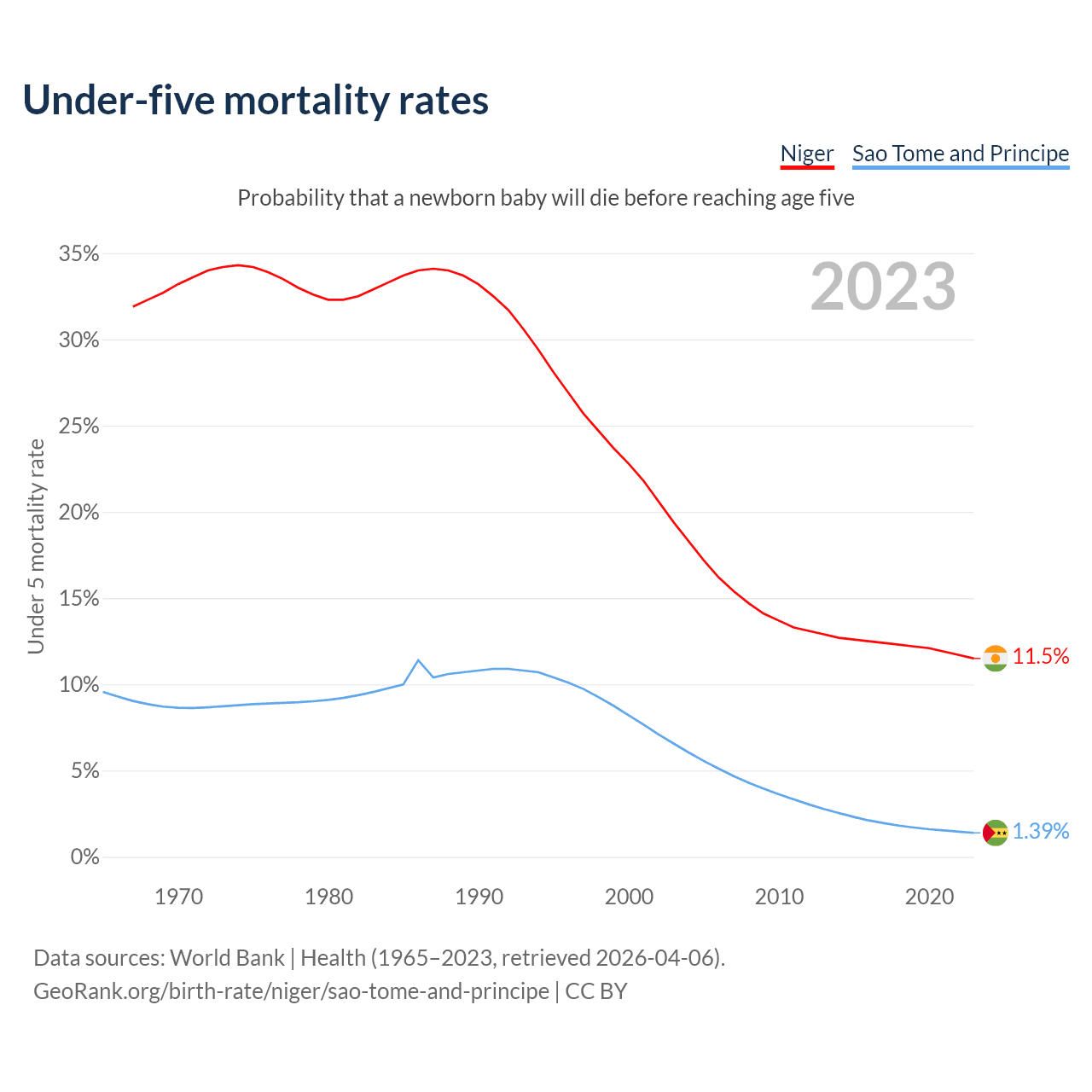 The chance that a newborn baby will die before reaching age five is 11.5% in Niger and 1.39% in Sao Tome and Principe. Above is a chart with historical data on under-five mortality rates.