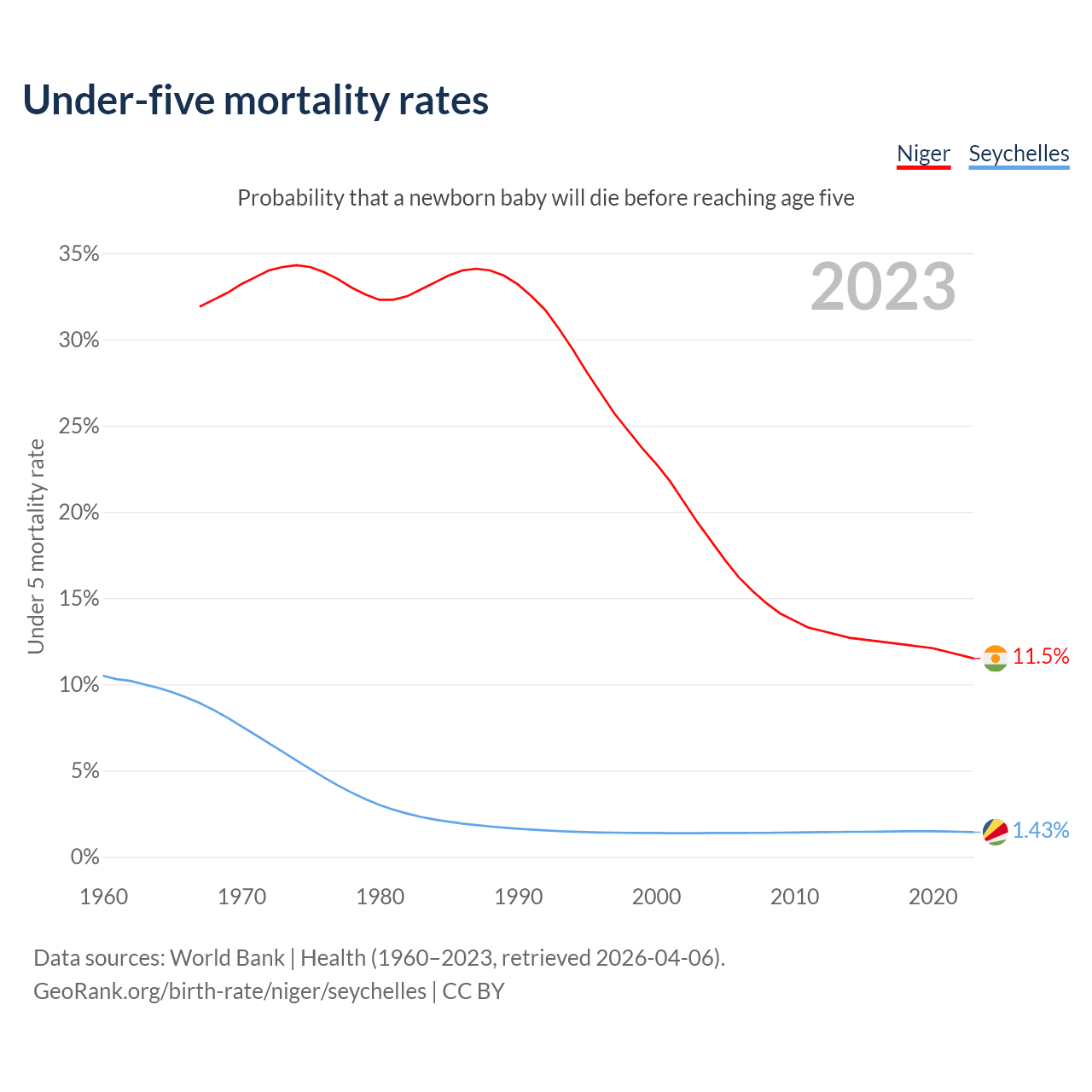 The chance that a newborn baby will die before reaching age five is 11.5% in Niger and 1.43% in the Seychelles. Above is a chart with historical data on under-five mortality rates.