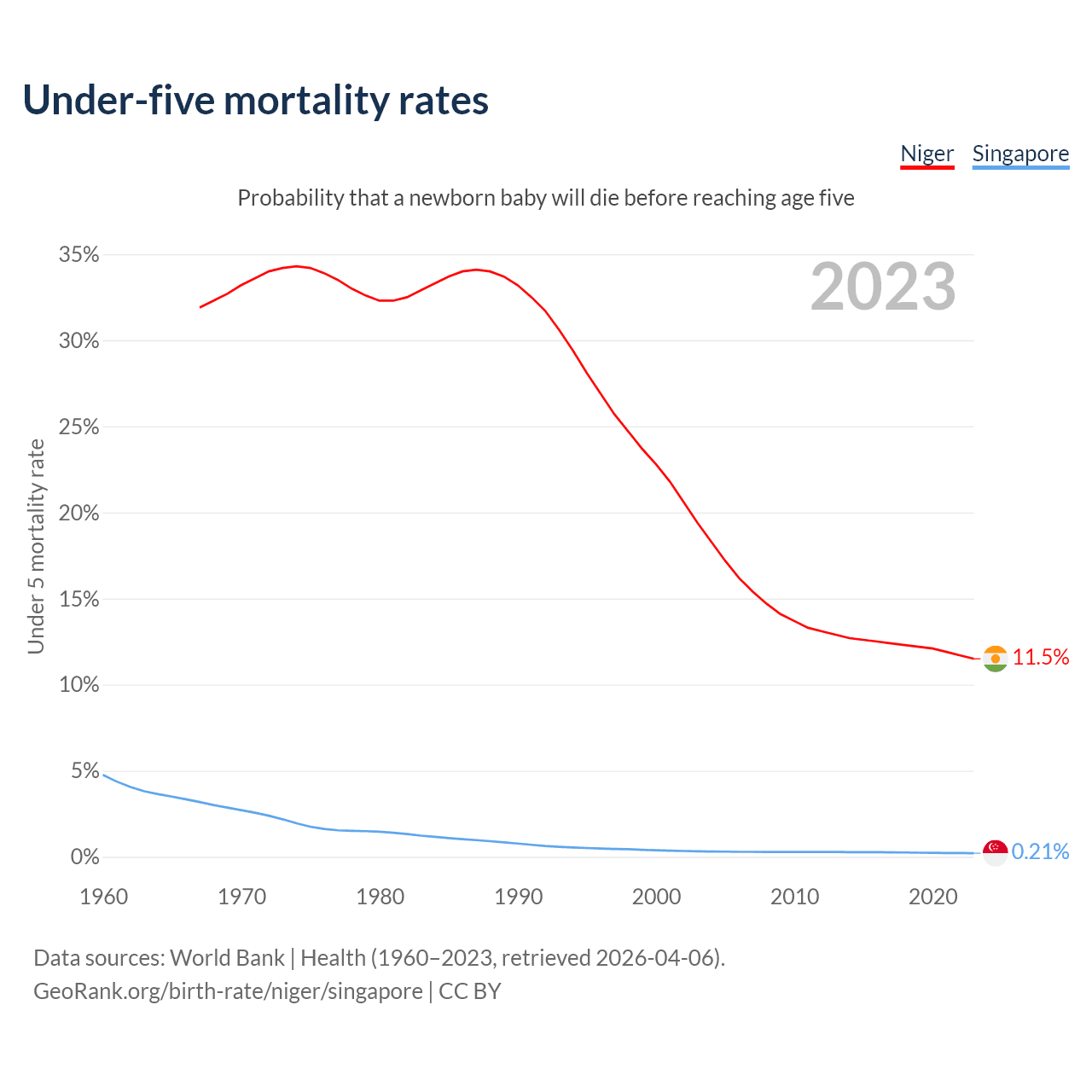 The chance that a newborn baby will die before reaching age five is 11.5% in Niger and 0.21% in Singapore. Above is a chart with historical data on under-five mortality rates.
