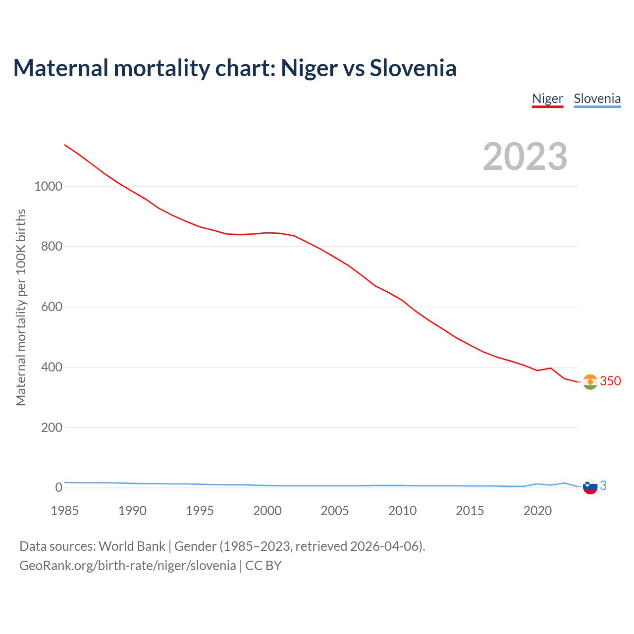 The maternal mortality rate, which is the probability of dying during childbirth or within 42 days of pregnancy termination, is 350 deaths per 100,000 live births in Niger, compared to 3 deaths in Slovenia.