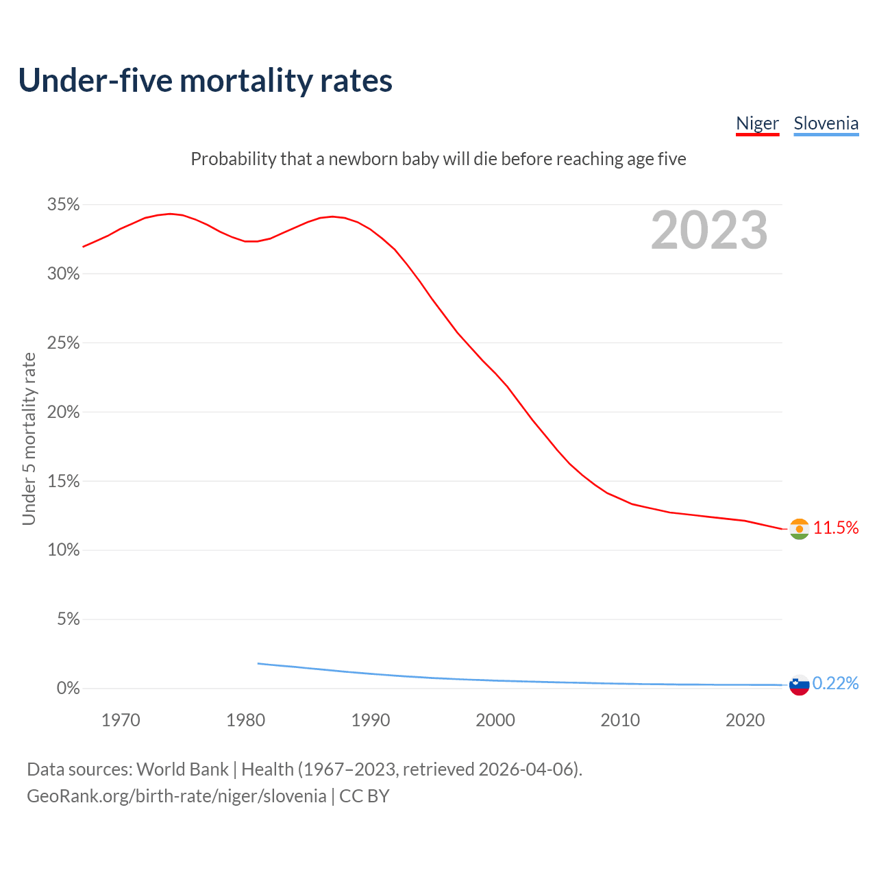 The chance that a newborn baby will die before reaching age five is 11.5% in Niger and 0.22% in Slovenia. Above is a chart with historical data on under-five mortality rates.