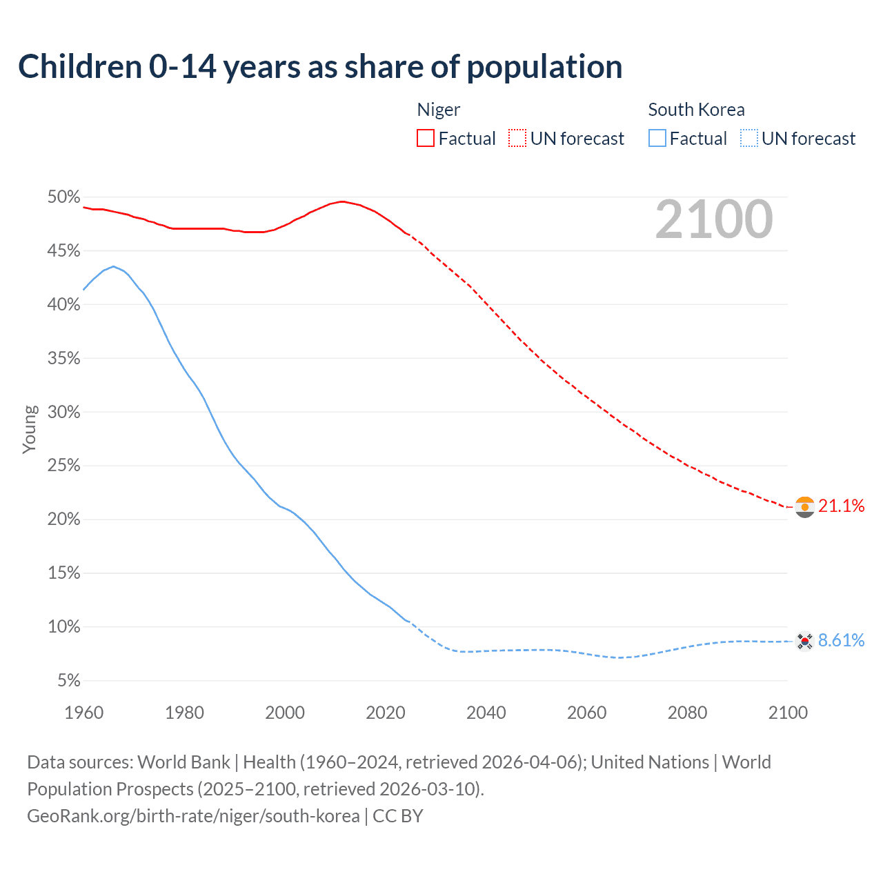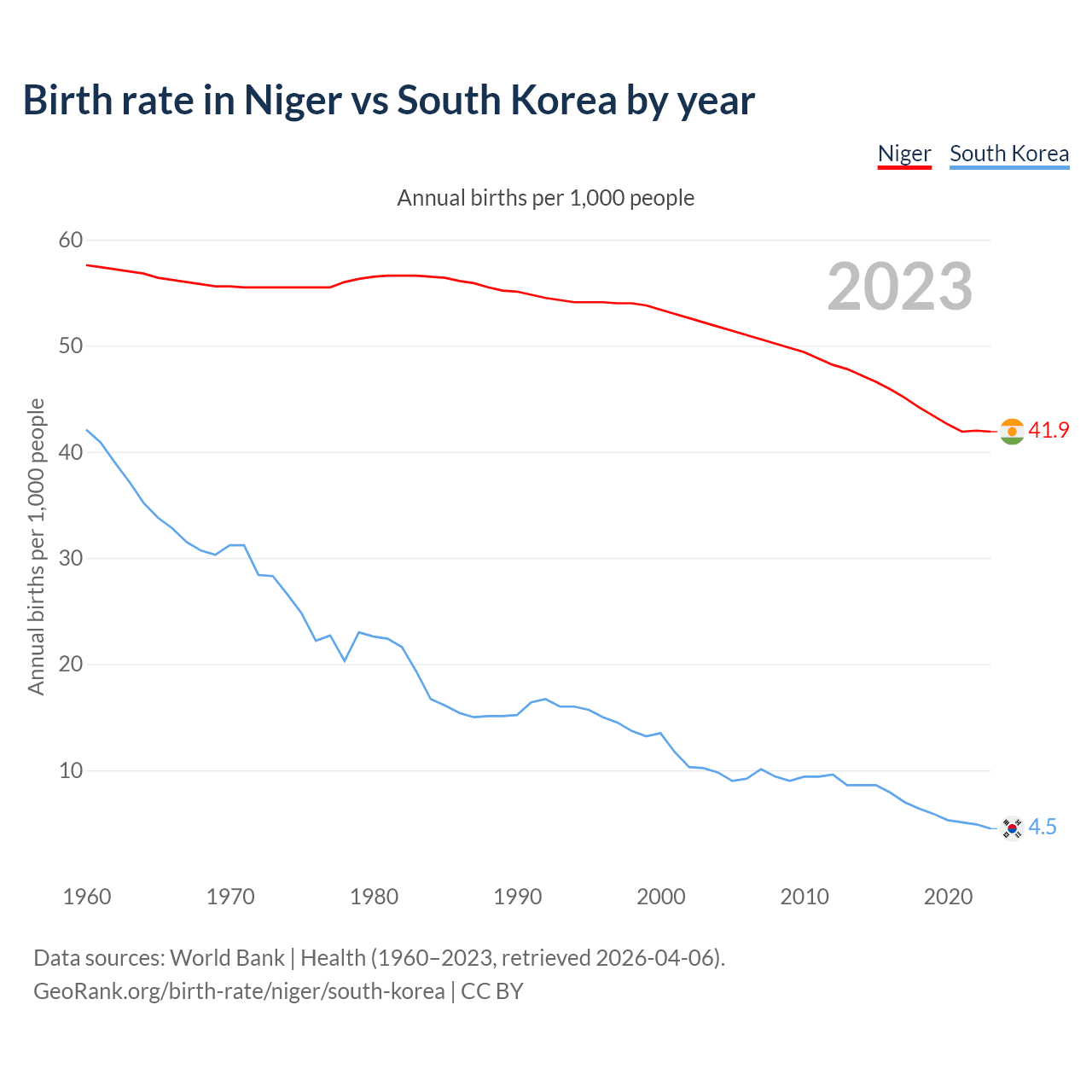 Niger has an annual birth rate of 41.9 births per 1,000 people, compared to 4.5 for South Korea. The average number of children a woman is expected to have during her lifetime — the fertility rate, is 6.06 in Niger and 0.72 in South Korea — 88.1% difference.